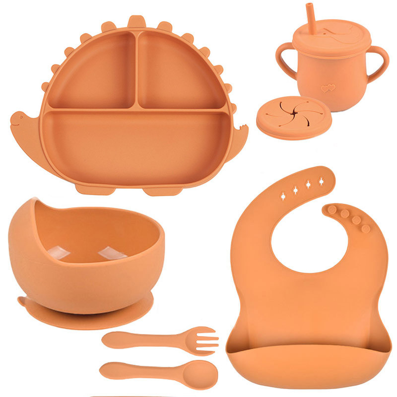 Набор силиконовой посуды, разработан и создан с учётом всех требований мам для кормления детей, состоит из предметов: 1. Трёхсекционная силиконовая тарелка 2. Круглая тарелка на присоске для первых блюд 3. Силиконовый слюнявчик с регулируемой застежкой и карманом 4. Вилка 5. Ложка 6. Поильник-непроливайка Набор посуды из силикона обладает рядом преимуществ и достоинств перед другими видами детской посуды: 1.Посуда из пищевого силикона не бьется и не имеет запаха 2. Представленный набор посуды имеет нужные изгибы для удобства при эксплуатации 3.Посуда изготовлена из пищевого силикона и соответсвует всем международным стандартам качества 4.Посуду можно стерилизовать и мыть в посудомоечной машине 5.Силиконовую посуду можно использовать в духовке, в пароварке или в СВЧ 6.Силиконовые тарелки: секционная и круглая снабжены присосками, что обеспечивает устойчивость посуды на столике для кормления или на любой другой гладкой и чистой поверхности. 7.Вся посуда сохраняет свой первоначальный вид в течении всего срока эксплуатации. Секционная силиконовая тарелка с трех секций на присоске в форме динозавра. В ней можно готовить пищу для ребёнка, совмещать разные виды продуктов по консистенции и по температуре. Тарелка снабжена присоской на дне и не скользит по поверхности столика - это особенно удобно когда малыш захочет учиться кушать самостоятельно, но также есть выступ, что бы легко отцепить липучку. Тарелочка круглая силиконовая на присоске, ее достаточно, как для начала первого прикорма так и для последующего кормления ребёнка. Слюнявчик - незаменимая вещь при кормлении малыша. Максимум комфорта для ребёнка и минимум уборки для мамы. Компактный и удобный в использовании для дома, детского сада, поездок, прогулок. Не требует стирки. Нагрудник достаточно протереть тряпочкой или салфеткой. Кармашек для улавливания пролитой еды отлично защищает одежду от загрязнений. Набор столовых приборов из пищевого силикона это идеальные вилочка и ложечка для начала прикорма. Удобные и аккуратные ложечка и вилочка с данного набора не повредят нежные ещё не окрепшими десна и первые зубики малыша даже при нажатии на столовые предметы. Особая форма и небольшой объём необходимы для плавного перехода малыша от груди к ложке. Силиконовый поильник для детей 3в1 чашка силиконовая с ручками, снечница, поильник с трубочкой. Данный поильник можно видоизменить благодаря специальным крышкам: это может быть Обучающий поильник, затем когда малыш подрастёт, он может быть Снек-стаканчиком - это как непроливайка для напитков, только непросыпайка для печенек, ягод, фруктов и многого другого. А когда малыш научится пить и кушать самостоятельно поильник станет Универсальной чашкой для разных напитков. Изделие изготовлено из 100% пищевого силикона и пригодно, как для горячих так и для холодных напитков. Наша рекомендация: перед использованием промыть теплой водой с добавлением нейтрального моющего средства. О разнице в цвете: Все товары сделаны на натуральных фотографиях. Из-за различных мониторов и освещения при съемке, факторов окружающей среды и т. д., есть небольшая разница в цвете, которая объективна и ее нельзя избежать! Хроматическая аберрация не является проблемой качества.