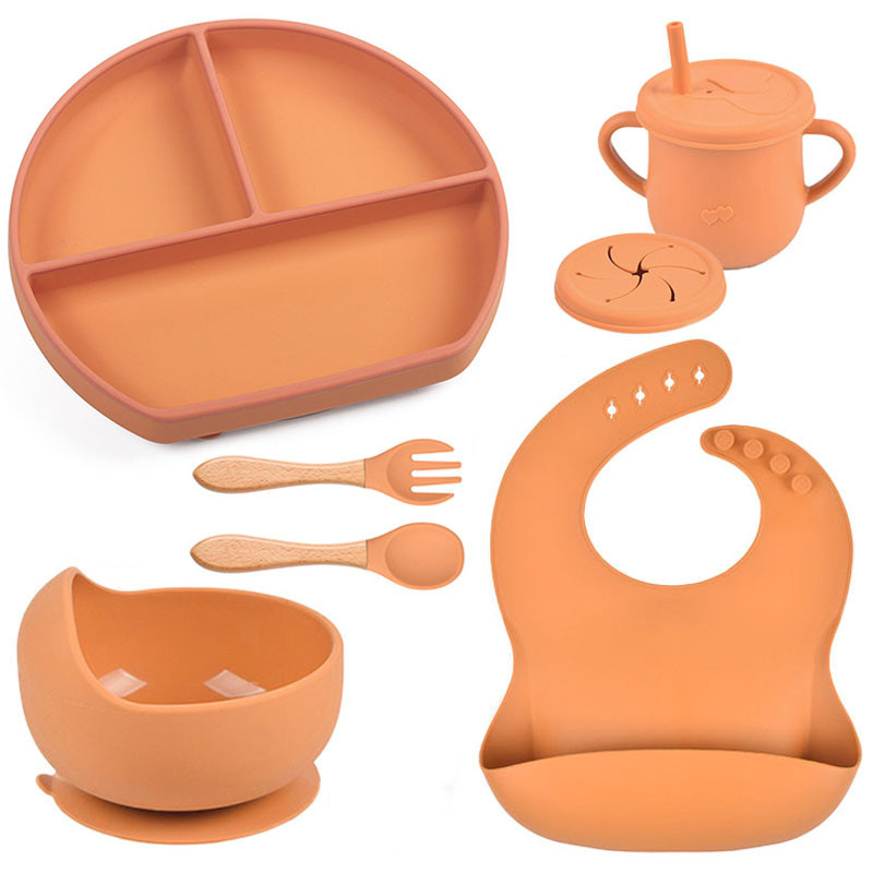 Набор детской силиконовой посуды 2Life Y25 из 7 предметов с деревянными приборами Оранжевый (v-11366)