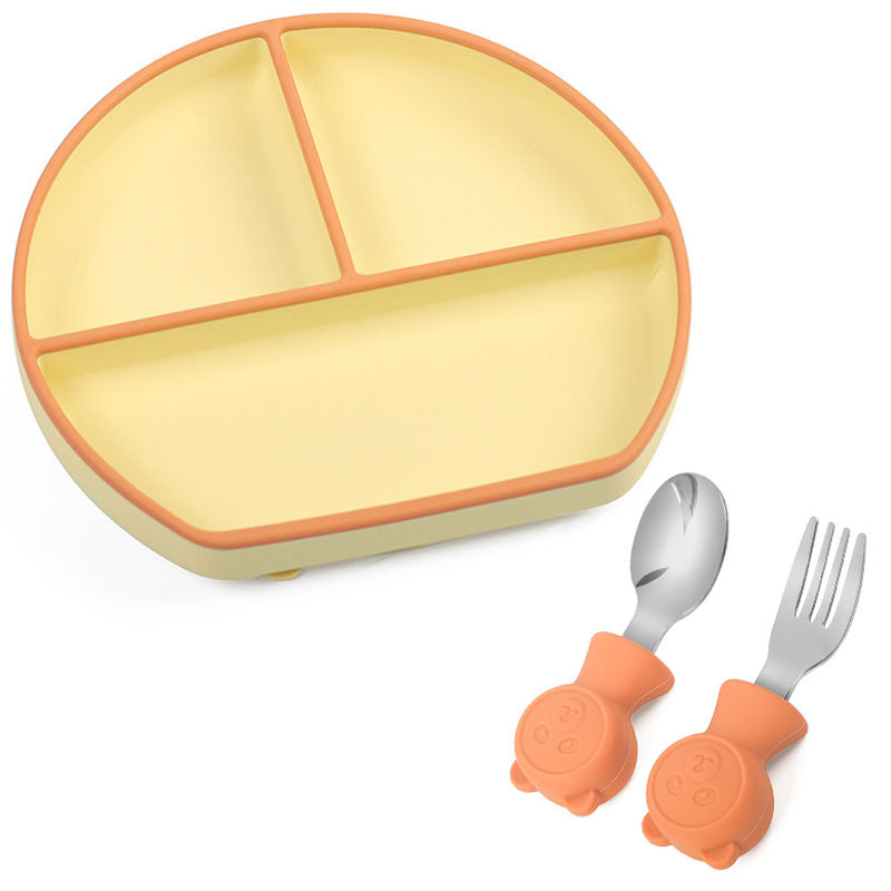 Силиконовая трехсекционная тарелка 2Life Y11 и металлические приборы Y25 Желтый с оранжевым (v-11549)