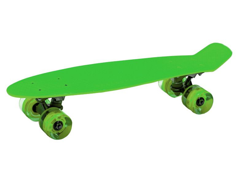 Пенни Борд. Легкая дека сделана из прочного формованного пластика. Подвеска скейта из прочного, но легкого алюминия. Колёса PU, со светом, d=6 см. Максимальная нагрузка до 70 кг.