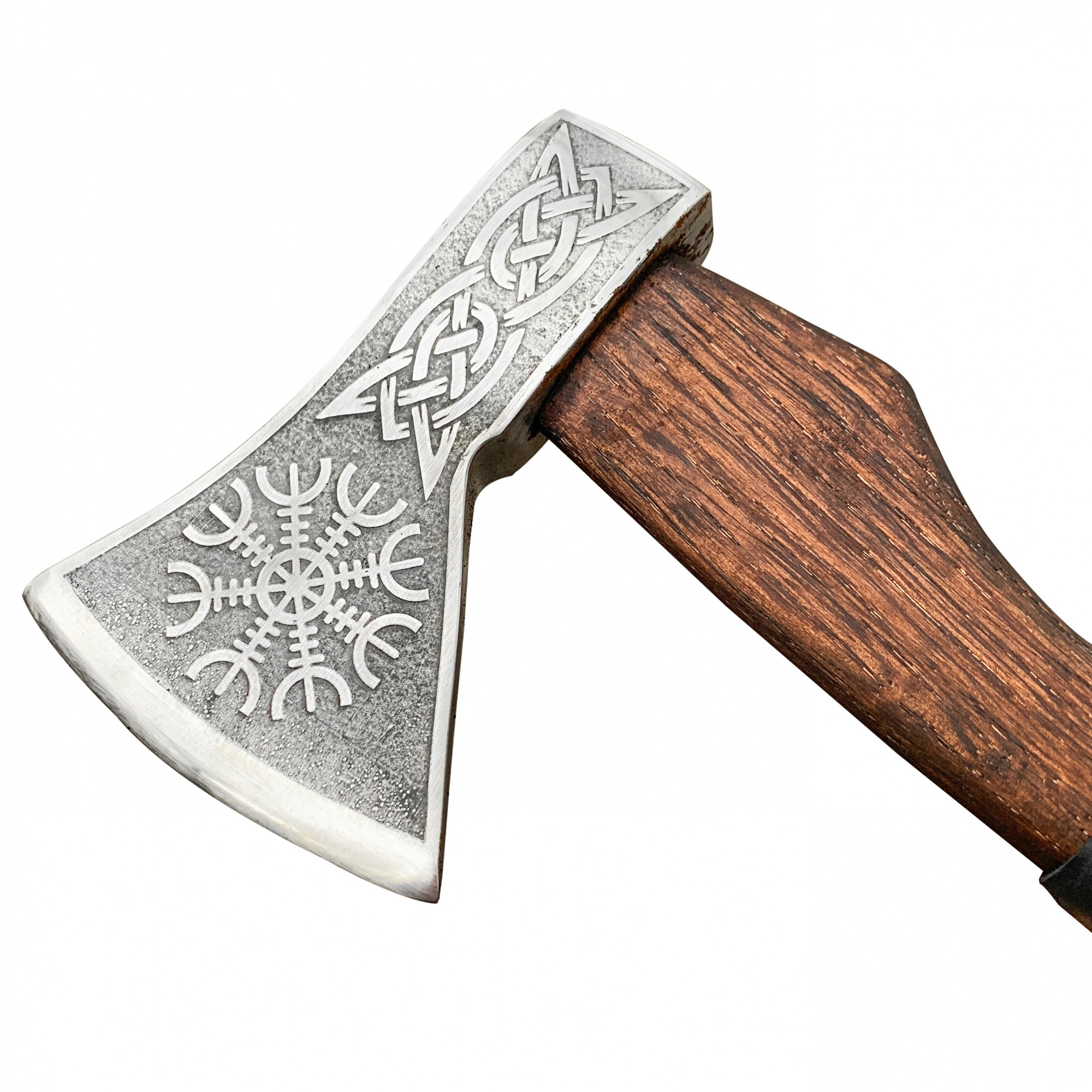 Голова топора украшена кельтскими узорами. Хорошо закалена рабочая часть лезвия. Долго держит заточку. Топорище крепиться с помощью 3х деревянных клиньев, очень надежно. Дополнительно можно заказать чехол на голову топора из натуральной кожи Crazy Horse