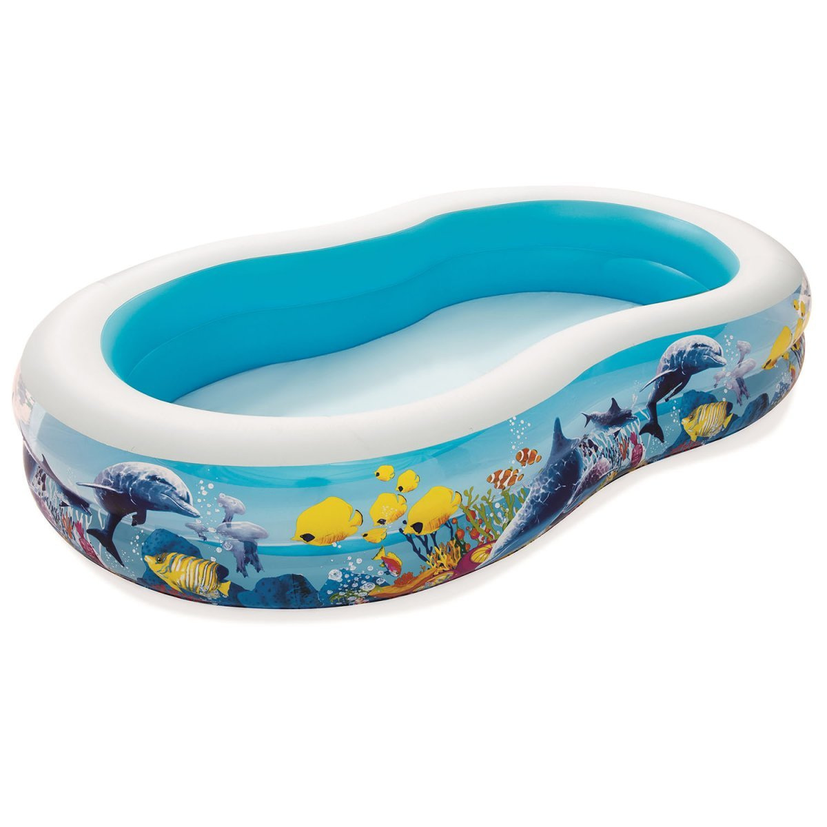 Прямоугольный семейный надувной бассейн Bestway "Подводный мир" для взрослых детей от 6 лет. Изготовлен из высококачественного винила, устойчивый, надежный и безопасный. Имеет мягкие стенки с широкими бортиками и жесткое дно из ПВХ-пленки.
