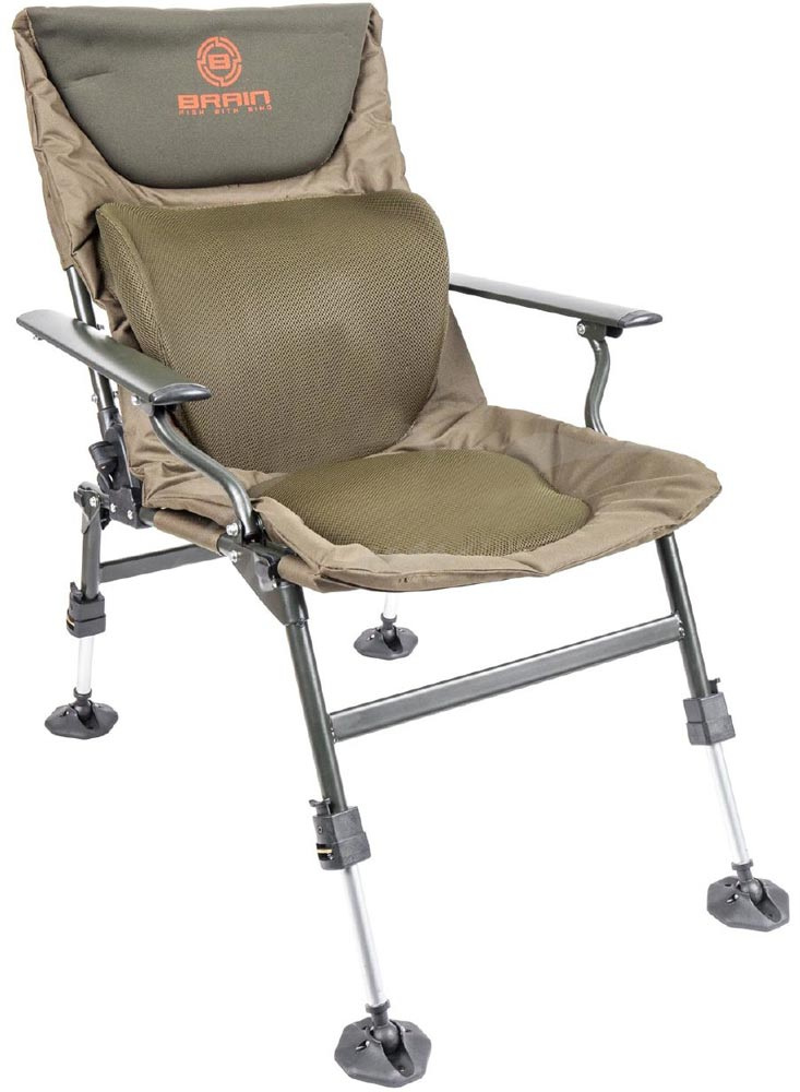 Brain Eco Recliner Armchair - среднее комфортное мягкое кресло с подлокотниками и регулируемой спинкой. Рама кресла выполнена из стали и алюминия. Благодаря четырем телескопическим ножкам кресло можно установить на местности с неровным рельефом. За счет шарнирного соединения объемных лап, кресло с легкостью адаптируется под любой наклон поверхности, а также не так сильно проваливается в мягкий грунт. Верх кресла выполнен из плотного износостойкого и легкомоющегося материала. Мягкое сиденье, быстрая и удобная регулировка угла наклона спинки в широких пределах, а также возможность откинуть спинку в горизонтальное положение, обеспечивают комфортное времяпровождение не только на рыбалке, но и отдыхе на природе. Допустимая нагрузка: до 100 кг