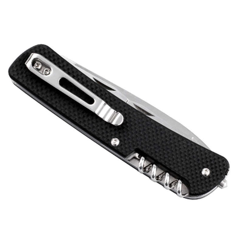 Представленная модель имеет очень простую конструкцию и отличается хорошей функциональностью, за счет того что она оснащена не только достаточно прочным и острым клинком, но и имеет на борту дополнительный клинок с серрейторной заточкой, отвертку с плоским шлицем, комбинированную с открывалкой, штопор. , а также стеклобой и съемные щипцы. Как основной клинок, так и все дополнительные инструменты сделаны из высококачественной стали марки Sandvik 12C27, которая в свою очередь была закалена до уровня 58-59 HRC. Эта особенность позволяет применять нож в самых разных условиях, без опасений, что он сломается, быстро затупится или заржавеет после контакта с водой.