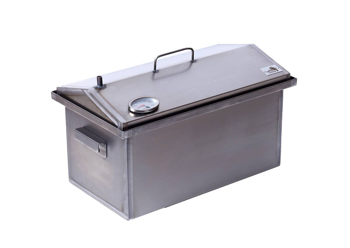 Большая коптилка оснащена удобной стеллажной системой загрузки продуктов, которая легко помещается внутрь. Крышка в форме домика обеспечивает герметичность и препятствует попаданию конденсата внутрь коптильной камеры.