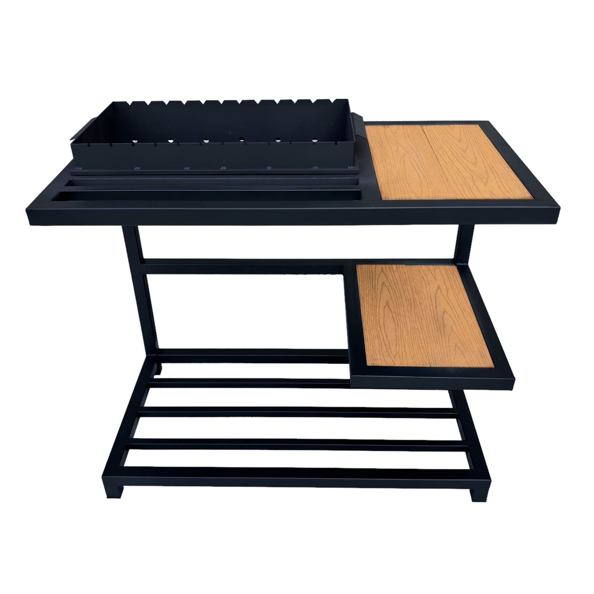 Мангал легко установить именно там, где это нужно сегодня. При этом в модели предусмотрено все, что нужно для удобства при приготовлении шашлыков – столики и полки для дров, углей, сосудов с замаринованным мясом, съемная жаровня на 12 шампуров со стенками толщиной 3 мм.
