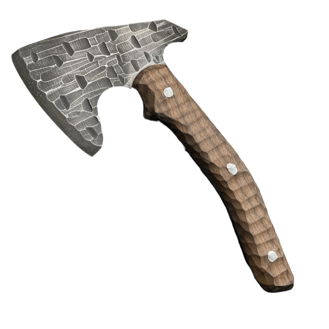 Голова топора украшена художественным эффектом битого камня и заворонена. Хорошо закалена рабочая часть лезвия. Долго держит заточку.
