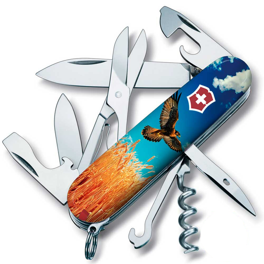 Эксклюзивный карманный нож CLIMBER UKRAINE [Свободный Сокол] с качественной цветной печатью на обеих накладках, покрытых глянцевым лаком. Профессиональное выполнение дизайна с украинскими смыслами. Специальное эстетичное предложение для украинских поклонников и коллекционеров бренда Victorinox.