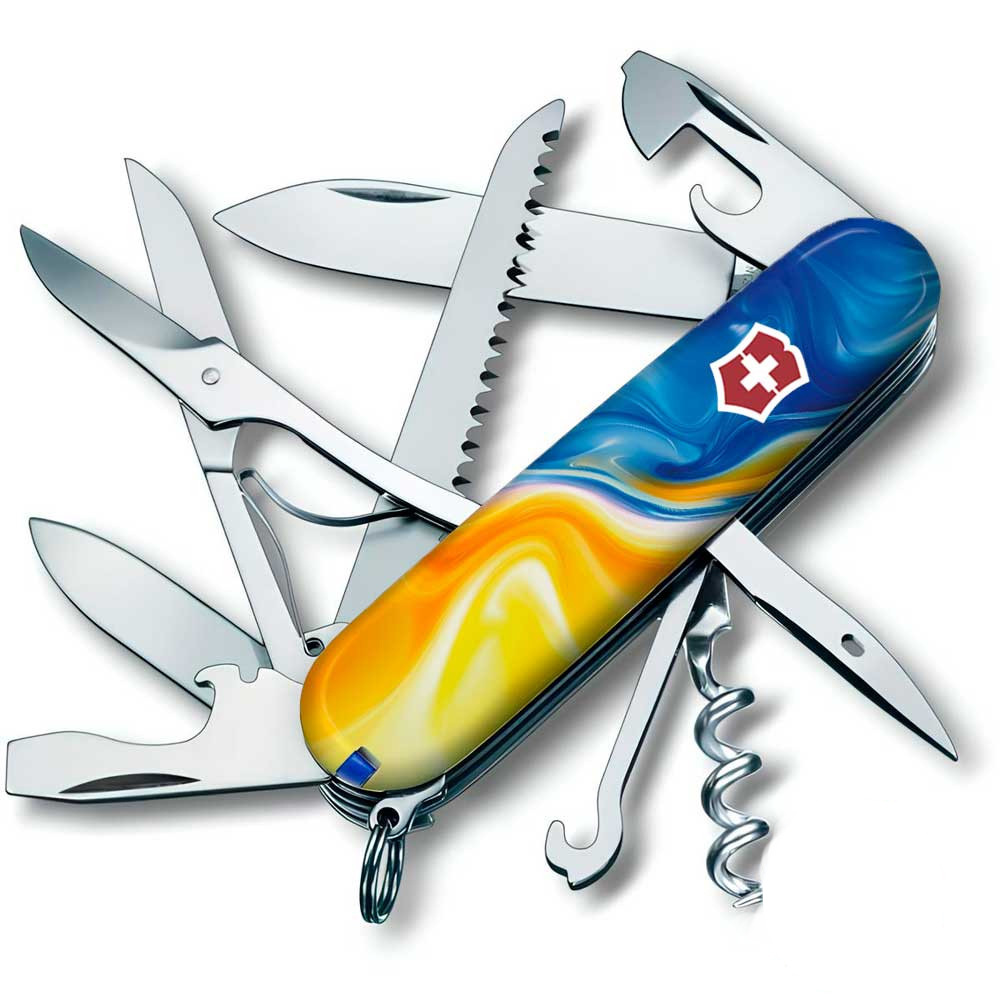 Эксклюзивный многофункциональный нож HUNTSMAN UKRAINE [Желто-синие краски] с абстрактной цветной печатью на обеих накладках, покрытых глянцевым лаком. Профессиональное выполнение дизайна с украинскими смыслами. Специальное эстетичное предложение для украинских поклонников и коллекционеров бренда Victorinox.