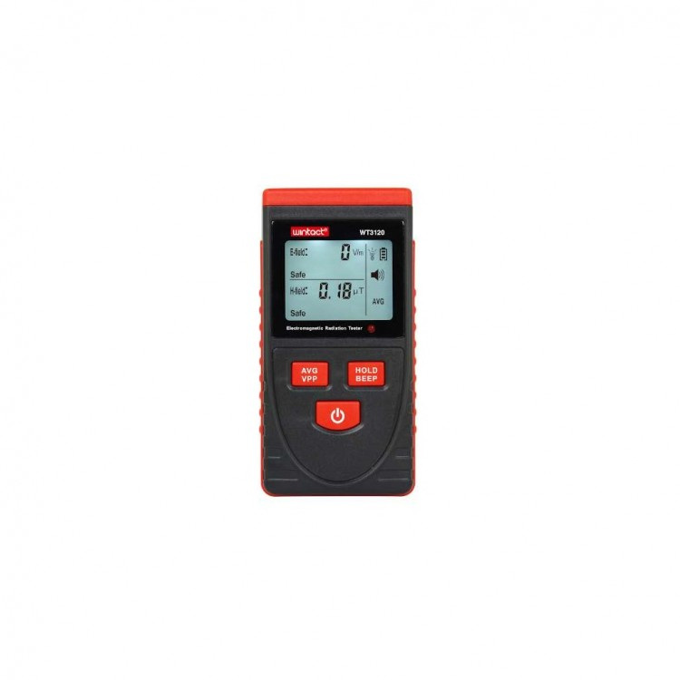 Детектор электромагнитного излучения WINTACT WT3120 это прибор, который предназначен для измерения параметров электромагнитного поля. Электрическое и магнитное поле - это составная часть электромагнитного излучения. Прибор представляет небольшой коробок. На передней панели расположен ЖК экран. Под экраном находится светодиод красного цвета, который срабатывает при пиковых показаниях прибора сигнализируя об опасном электромагнитном излучении. Еще ниже расположены три кнопки управления: AVG/VPP – кнопка предназначена для переключения между средними и максимальными показаниями прибора; HOLD/BEEP –предназначена для удержания результата измерения и включения/выключения звукового сигнала тревоги; Кнопка включения/выключения прибора. Удержание этой кнопки включает или выключает детектор, а краткое нажатие подсвечивает экран. При включении детектора, верхняя часть экрана показывает напряжённость электрического поля в В/м (Вольт/метр), нижняя часть показывает плотность потока магнитной индукции в мкТл (в 0,000001Тл). Диапазон измерения детектора излучения от 1 до 1999 В/м при измерении напряженности электрического поля и от 0,01 до 99,99 мкТл при измерении потока магнитной индукции. Электромагнитные поля негативно воздействуют на человеческий организм, поэтому допустимые значения напряженности электрического поля и потока магнитной индукции четко регламентированы Всемирной организацией здравоохранения (ВОЗ). Детектор излучения WT3120 при показаниях более 40 В/м и/или 0,4 мкТл будет сигнализировать об опасном электромагнитном излучении.