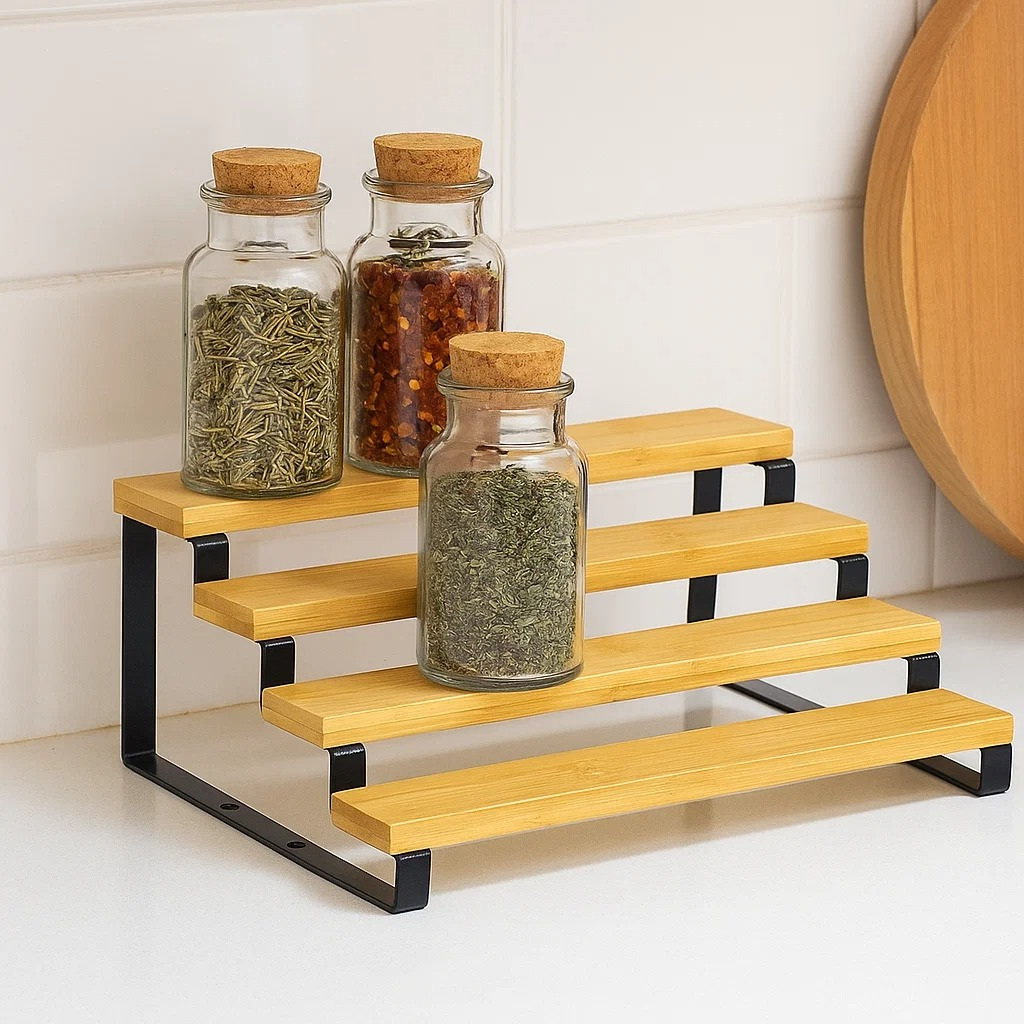 Многоярусная ступенчатая полка отлично подойдёт для организации пространства как на кухне, так и в ванной комнате. Она позволяет удобно разместить банки со специями, соусы, бутылочки, косметику или банные принадлежности, обеспечивая быстрый доступ к каждому предмету. Благодаря прочной конструкции из дерева и металла, полка остаётся устойчивой и долговечной даже при ежедневном использовании.