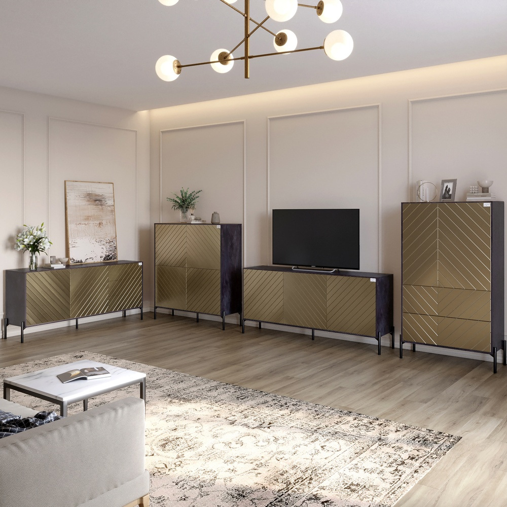 Гарнитур в гостиную 4 элемента LION Амарант Комплект мебели для гостиной LION Амарант - сочетает в себе элегантность минимализма и высокую функциональность. Стильные фасады с выразительным диагональным узором станут акцентным элементом современного интерьера. В состав комплекта входят комод, пенал, тумба ТВ, а также комод-пенал. Лаконичные линии, текстурные фасады и черные металлические ножки создают эффектный внешний вид. Комплект идеально подходит для интерьеров в стиле минимализм, лофт или модерн. Материал изготовления Комод изготовлен из ЛДСП SWISS KRONO - высококачественного материала, сочетающего эстетику с прочностью и надежностью. ЛДСП от SWISS KRONO известен своей стойкостью к механическим повреждениям, влаге и высоким температурам, что гарантирует долговечность мебели и сохраняет ее эстетичный вид на долгие годы. Металлические ножки обеспечивают устойчивость и придают изделию современного стиля, дополняя общий образ тумбы. Особенности Модульная структура. Каждый модуль выполняет свою роль: хранение одежды, аксессуаров, книг, мультимедийной техники или декора. Возможность самостоятельной компоновки модулей позволяет адаптировать комплект к размерам и функциональным потребностям вашего помещения. Минималистичная фурнитура. Отсутствие внешних ручек делает конструкцию более лаконичной. Прочные металлические ножки. Ножки из черного металла обеспечивают высокую устойчивость и выдерживают значительные нагрузки. Высота ножек упрощает уборку под мебелью и добавляет визуальной легкости конструкции. Кромка 2 мм - защищает края изделий от повреждений, придает им эстетически завершенный вид и повышает долговечность мебели. Кромку изготавливают из прочных материалов, что позволяет ей выдерживать интенсивное использование и сохранять привлекательный внешний вид в течение многих лет. Размеры: Комод: Ширина: 1680 мм Глубина: 400 мм Высота: 765 мм Тумба для ТВ: Ширина: 1680 мм Глубина: 400 мм Высота: 765 мм Пенал: Ширина: 840 мм Глубина: 400 мм Высота: 1500 мм Комод-пенал: Ширина: 1140 мм Глубина: 400 мм Высота: 1265 мм