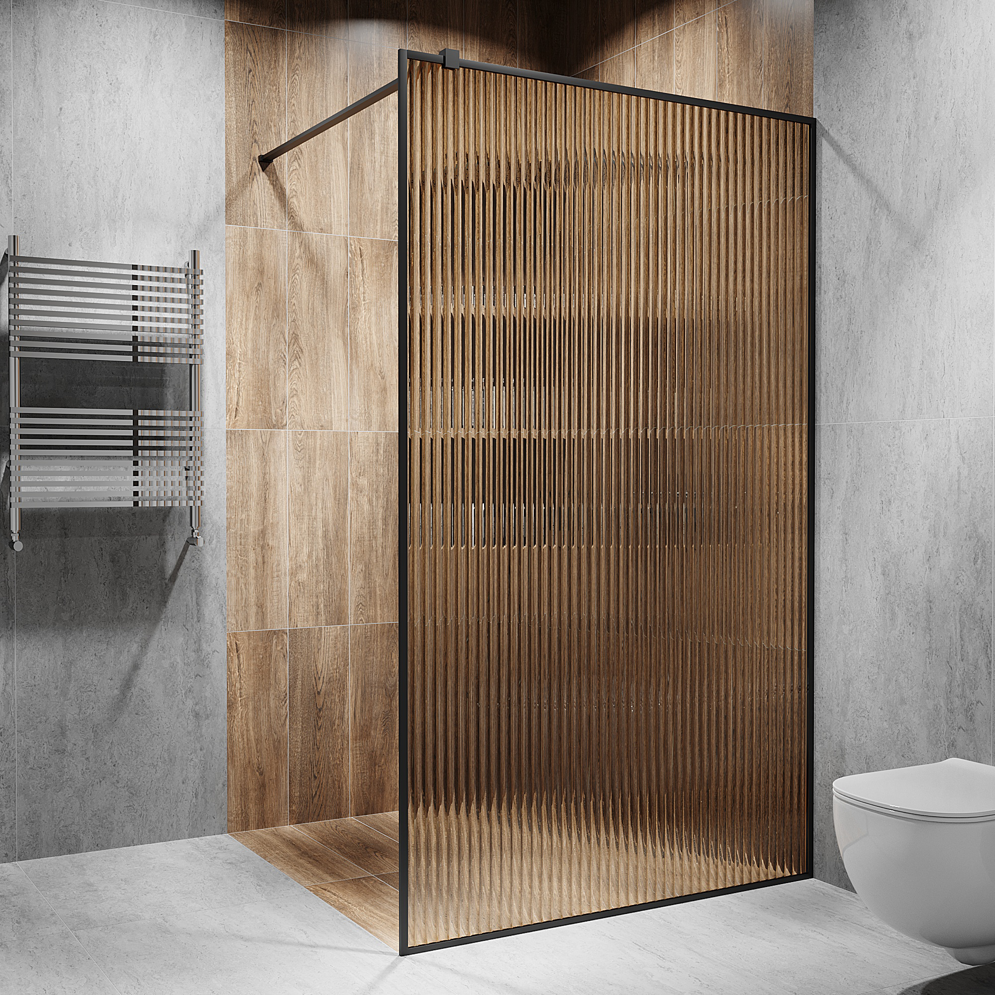 Скляна душова перегородка з триплексу Model-AF - це міцність, безпека і виразний дизайн в одному рішенні. Два шари скла, скріплені плівкою, роблять конструкцію максимально надійною: навіть у разі сильного удару скло не розлітається на осколки, а залишається на плівці. Зовнішня рифлена поверхня не тільки приховує силует, а й додає інтер'єру характер, граючи світлом і створюючи об'єм. Рамка профілю по периметру приховує торцевого вигляду скла, а також надає звичайний зовнішній вигляд. Обирайте прозоре скло, якщо хочете зберегти відчуття простору, бронзове - для теплого, затишного ефекту, графітове - для виразних контрастів. Таке скло пропускає м'яке розсіяне світло, не затемнюючи приміщення, але при цьому дає комфортну приватність. Крім того, триплекс має хороші шумоізоляційні властивості - в душовій стане тихіше, а звуки води нікому не заважатимуть. Ще один плюс - зручність у догляді. Гладка поверхня легко очищається від крапель і мильних розводів, а загартована структура скла запобігає появі тріщин і відколів. Для додаткового акценту можна підібрати фурнітуру: блискуча або матова сталь, глибокий чорний, універсальний білий, а також теплі відтінки золота і бронзи. В Альфа Глас ми робимо перегородки на замовлення, повністю під ваші розміри і дизайн. Беремося за складні проекти, працюємо під ключ - від замірів до встановлення. Вам залишається тільки вибрати стиль, а ми забезпечимо точність, якість і довговічність!