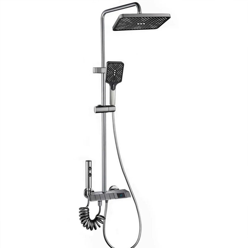 Індикатор працює від потоку води та не вимагає підключення до електромережі або батарей, що робить систему повністю автономною та безпечною. Корпус виконаний з міцної латуні з матовим графітовим покриттям, стійким до вологи, вапняного нальоту, подряпин та побутової хімії. Верхній душ є широкою прямокутною панеллю, що створює м'який потік в режимі «тропічного дощу», а ручна лійка з гнучким шлангом дозволяє зручно спрямовувати струмінь води за бажанням. Управління здійснюється за допомогою плавних поворотних перемикачів, а настінний монтаж забезпечує надійну та компактну установку.