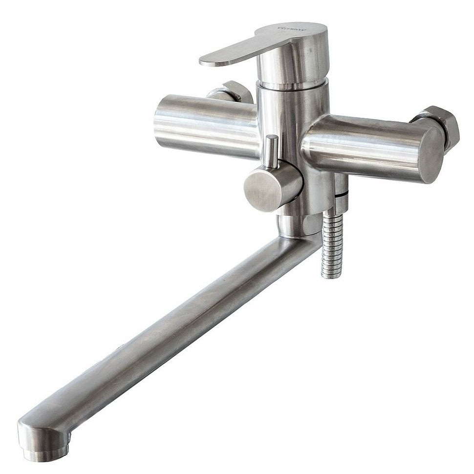 Змішувач для ванни Platinex KT 15 з довгим виливом, виконаний з нержавіючої сталі, є універсальним і надійним рішенням для ванної кімнати. Корпус виготовлений із сталі марки SUS304, яка відрізняється високою міцністю, стійкістю до корозії та довговічністю навіть при постійному контакті з водою. Довгий поворотний вилив забезпечує зручність використання як для наповнення ванни, так і для умивальника, якщо змішувач встановлений на два сантехнічні прилади одночасно.