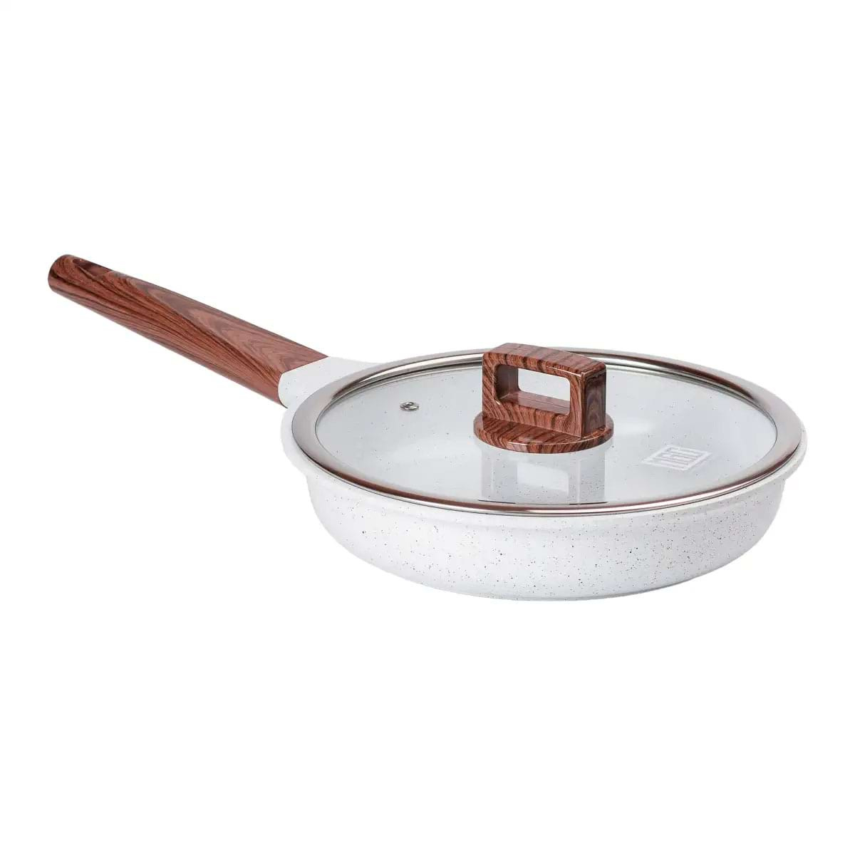 Сковорода диаметром 24 см - универсальный вариант для приготовления небольших порций пищи. Посуда изготовлена из литого алюминия, хорошо проводит тепло и обеспечивает равномерное приготовление. Сковорода имеет антипригарное керамическое покрытие, благодаря чему можно готовить блюда с минимальным количеством масла, а гладкая внутренняя поверхность облегчает мытье. Для удобства использования посуда имеет бакелитовую ручку, которая не нагревается и минимизирует вероятность получения ожогов.