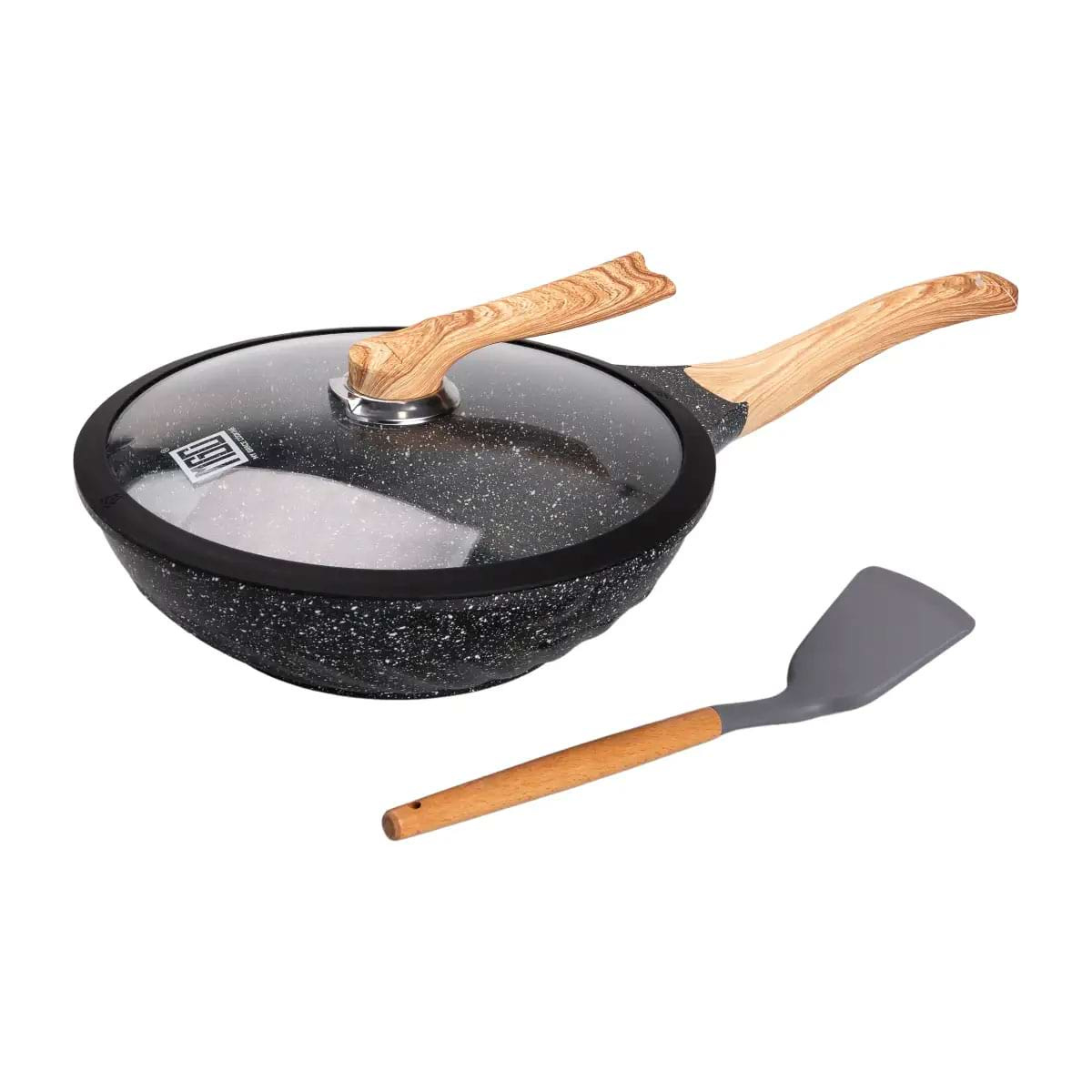 Кроме того, быстрое обжаривание дает возможность сохранить вкус и полезные вещества овощей, мяса и морепродуктов, а высокие стенки и широкое дно идеально подходят для легкого перемешивания и больших объемов пищи. Сковорода имеет антипригарное покрытие, что позволяет готовить с минимальным количеством животных и растительных жиров. Удобная бакелитовая ручка не нагревается и снижает до минимума риск получения ожогов.