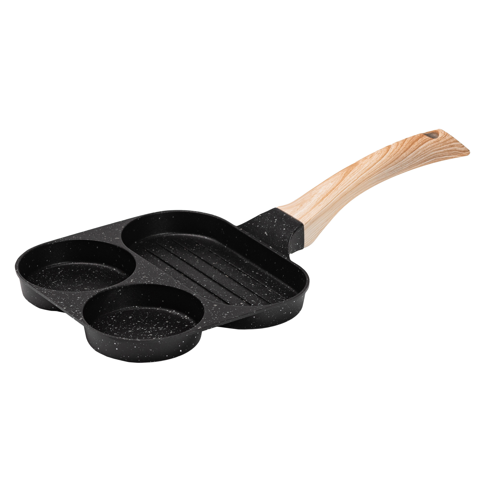 Сковорода для завтрака с антипригарным покрытием станет вашим незаменимым помощником для приготовления вкусных и разнообразных блюд. Изготовленная из высококачественного алюминия, эта сковорода имеет три секции, что позволяет готовить различные ингредиенты одновременно. Одна прямоугольная секция объемом 220 мл и две круглые секции по 120 мл каждая идеально подходят для создания сбалансированного завтрака, удовлетворяя потребности всей семьи.