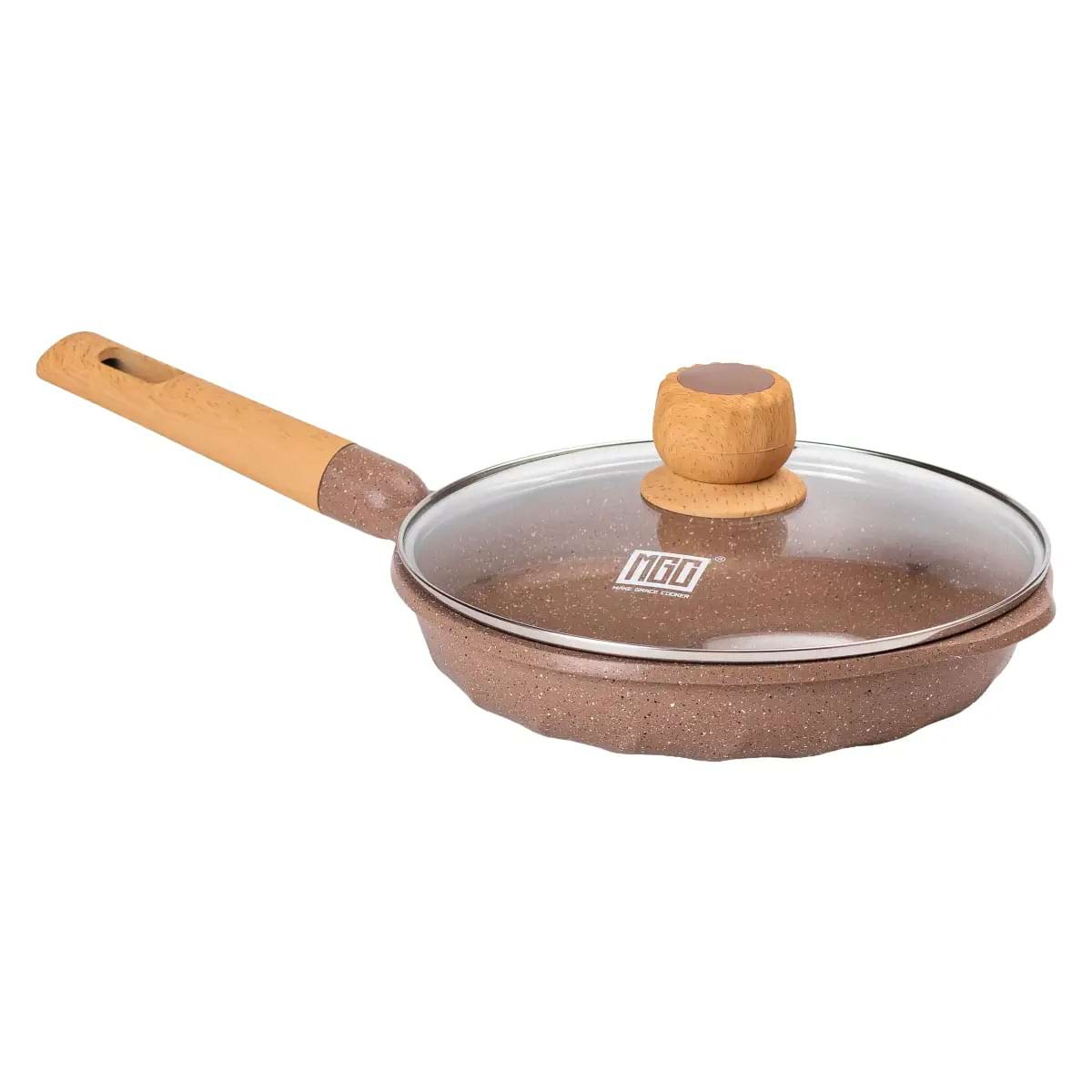 Сковорода диаметром 24 см - отличный выбор для приготовления пищи на несколько человек или для небольшой семьи. Посуда изготовлена из литого алюминия, хорошо проводит тепло и обеспечивает равномерное приготовление. Сковорода имеет антипригарное мраморное покрытие, благодаря чему можно готовить блюда с минимальным количеством масла, а гладкая внутренняя поверхность облегчает мытье. Для удобства использования посуда имеет бакелитовую ручку, которая не нагревается и минимизирует вероятность получения ожогов.