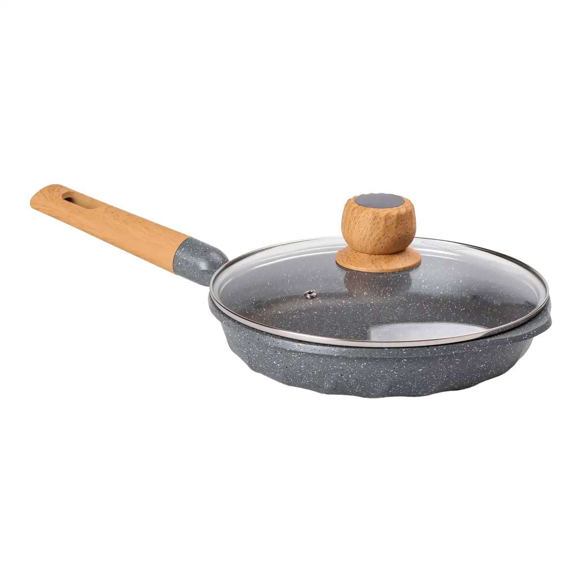 Сковорода диаметром 24 см - отличный выбор для приготовления пищи на несколько человек или для небольшой семьи. Посуда изготовлена из литого алюминия, хорошо проводит тепло и обеспечивает равномерное приготовление. Сковорода имеет антипригарное мраморное покрытие, благодаря чему можно готовить блюда с минимальным количеством масла, а гладкая внутренняя поверхность облегчает мытье. Для удобства использования посуда имеет бакелитовую ручку, которая не нагревается и минимизирует вероятность получения ожогов.