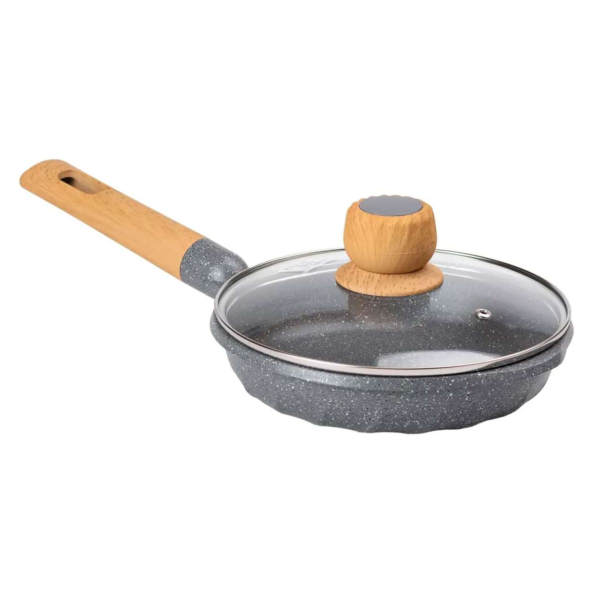 Сковорода диаметром 20 см - отличный выбор для приготовления небольших порций пищи. Посуда изготовлена из литого алюминия, хорошо проводит тепло и обеспечивает равномерное приготовление. Сковорода имеет антипригарное мраморное покрытие, благодаря чему можно готовить блюда с минимальным количеством масла, а гладкая внутренняя поверхность облегчает мытье. Для удобства использования посуда имеет бакелитовую ручку, которая не нагревается и минимизирует вероятность получения ожогов.