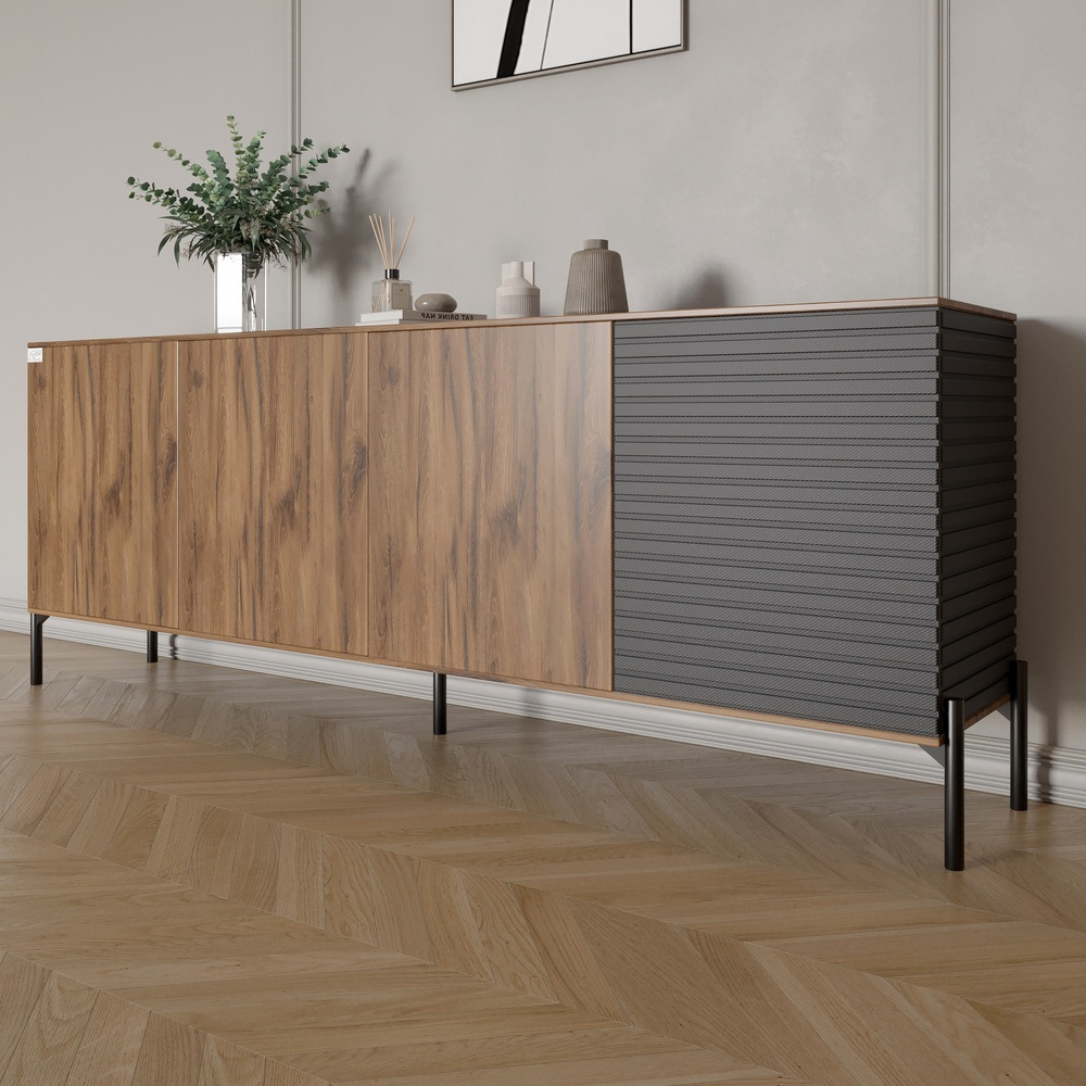 Комод LION Грей Комод из коллекции «Грей» изготовлен из высококачественных материалов и станет отличным решением для современного интерьера, сочетающим лаконичность форм и изысканные текстуры. Его гладкий фасад дополнен текстурной секцией, что добавляет интересный визуальный акцент, выделяя комод на фоне других предметов мебели. Металлические ножки придают конструкции легкость, обеспечивая устойчивость и долговечность. Просторные секции внутри комода обеспечивают удобное хранение разнообразных вещей, включая одежду, постельное белье, аксессуары или документы. Благодаря своей универсальности комод отлично будет смотреться в спальне, гостинной или рабочем кабинете. Материал изготовления Комод изготовлен из ЛДСП SWISS KRONO - высококачественного материала, сочетающего эстетику с прочностью и надежностью. ЛДСП от SWISS KRONO известен своей устойчивостью к механическим повреждениям, влаге и высоким температурам, что гарантирует долговечность мебели и сохраняет ее эстетический вид на долгие годы. Ножки комода изготовлены из металла. Особенности 4 отделения с полками - обеспечивают максимальный комфорт в использовании и позволяют хранить различные вещи в организованном порядке. Комод предлагает достаточно места для хранения белья, аксессуаров и других предметов. Прочные металлические ножки - ножки выполнены из качественного металла, который выдерживает значительные нагрузки и обеспечивает стабильность. Высокий просвет между полом и комодом позволяет легко убирать под ним, поддерживая чистоту. Минималистичный дизайн - отсутствие выступающих ручек подчеркивает минималистичный стиль и исключает случайные зацепы. Кромка 2 мм - защищает края изделий от повреждений, придает им эстетически завершенный вид и повышает долговечность мебели. Кромку изготавливают из прочных материалов, что позволяет ей выдерживать интенсивное использование и сохранять привлекательный внешний вид на протяжении многих лет. Размеры: Ширина: 2040 мм Глубина: 380 мм Высота: 765 мм