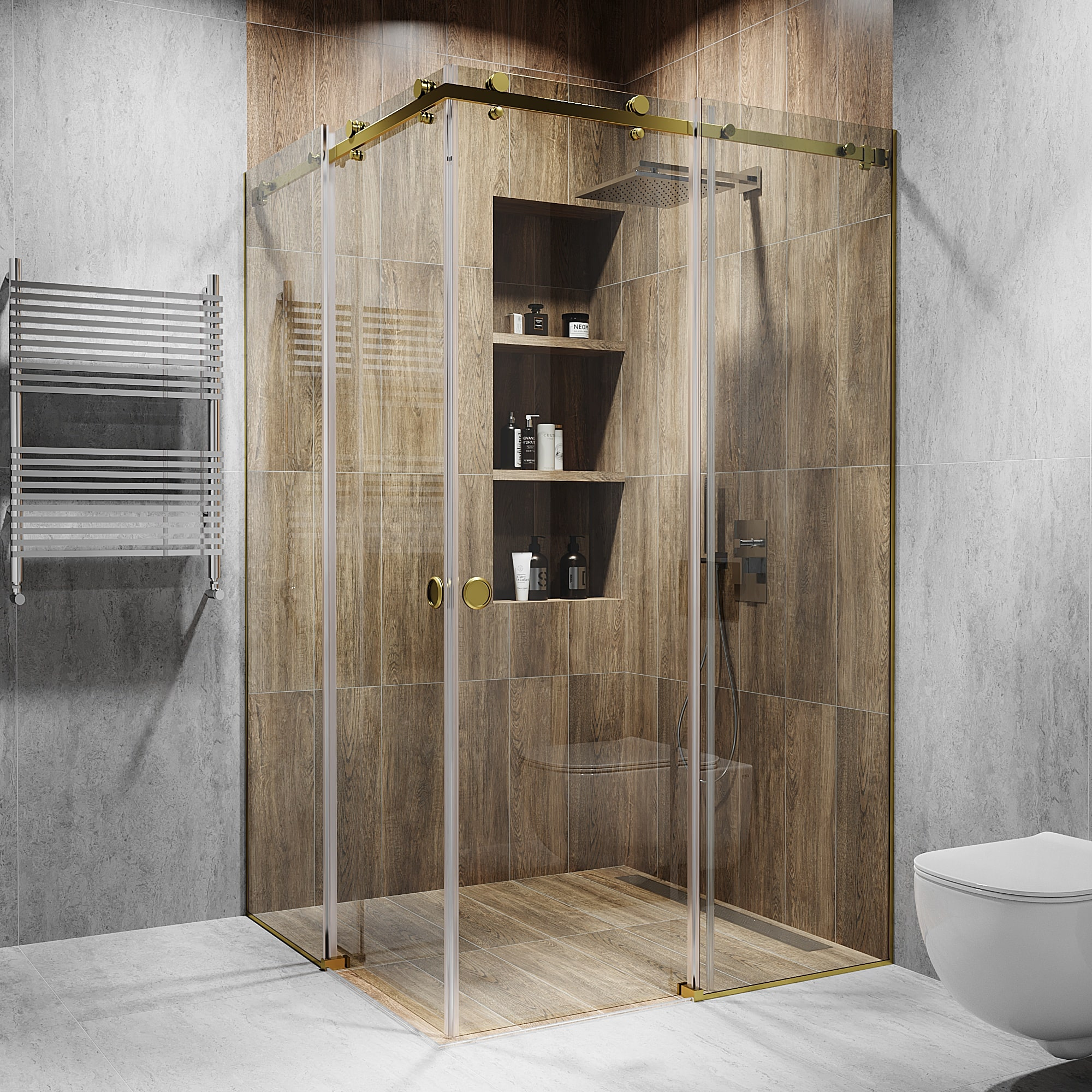 Кутова розсувна душова кабіна з двома дверима 2000 мм, Прозоре, Без матування, Gold - Золото поліроване