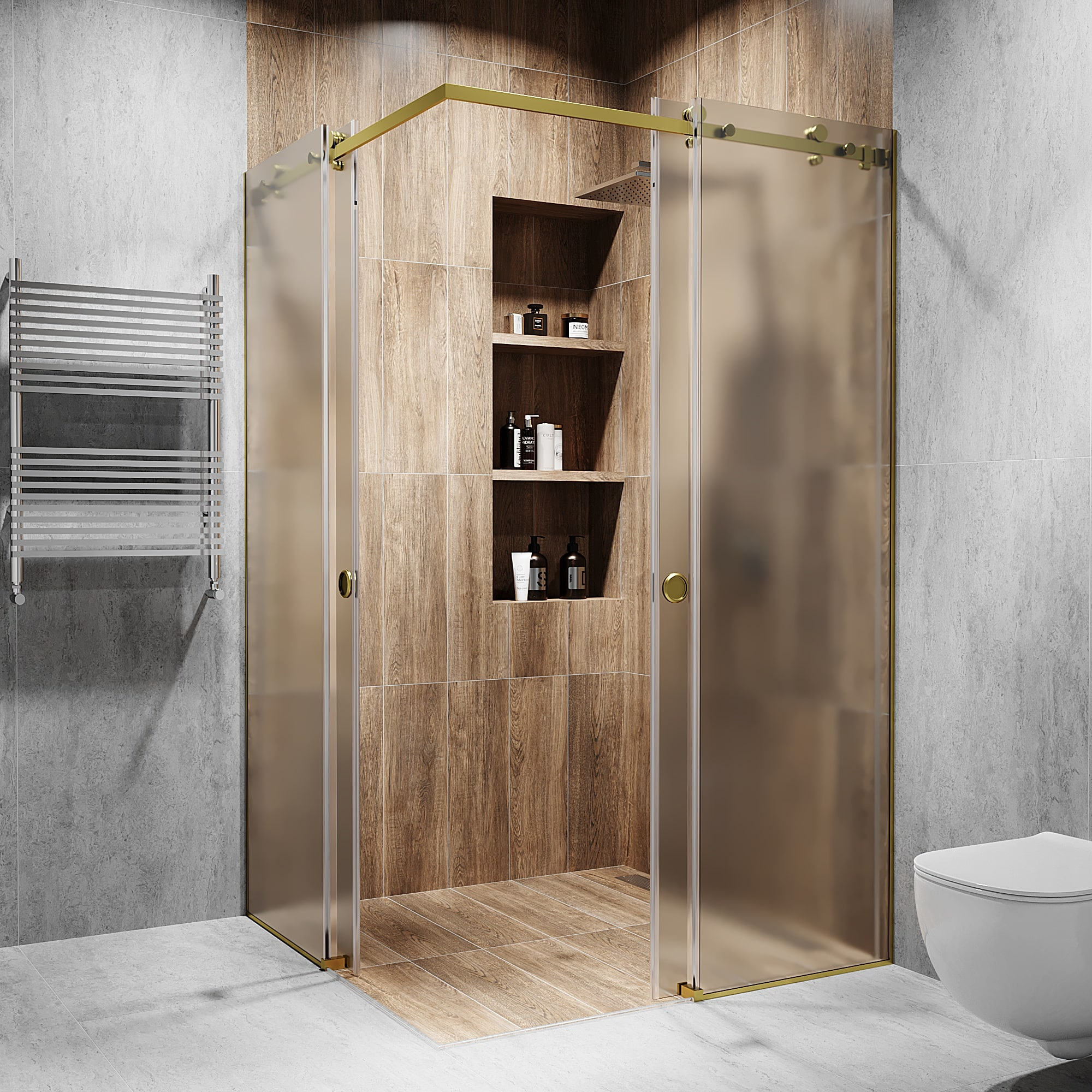 Кутова розсувна душова кабіна з двома дверима 2000 мм, Прозоре, Матоване, Gold - Золото поліроване