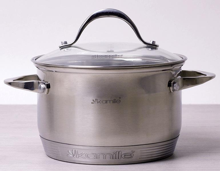 Кастрюля Kamille Mystery 3.9л со стеклянной крышкой. Диаметр 20см, высота стенок 12.5см. Изготовлена из высококачественной нержавеющей стали. Внешняя поверхность матирована, по верху декоративная глянцевая полоса. На внутренней стенке нанесена мерная шкала. Ручки цельнолитые из нержавеющей стали с прочным клепочным креплением. Дно 7-слойное, индукционное, имеет исключительно высокие термоаккумулирующие и энергосберегающие свойства, равномерно прогревается и долго сохраняет тепло. Кастрюля годится для всех типов плит, включая индукционные и стеклокерамические плиты. Крышка стеклянная, прозрачная, с пароотводом и с ободом из нержавеющей стали для защиты от сколов. Можно мыть в посудомоечной машине.