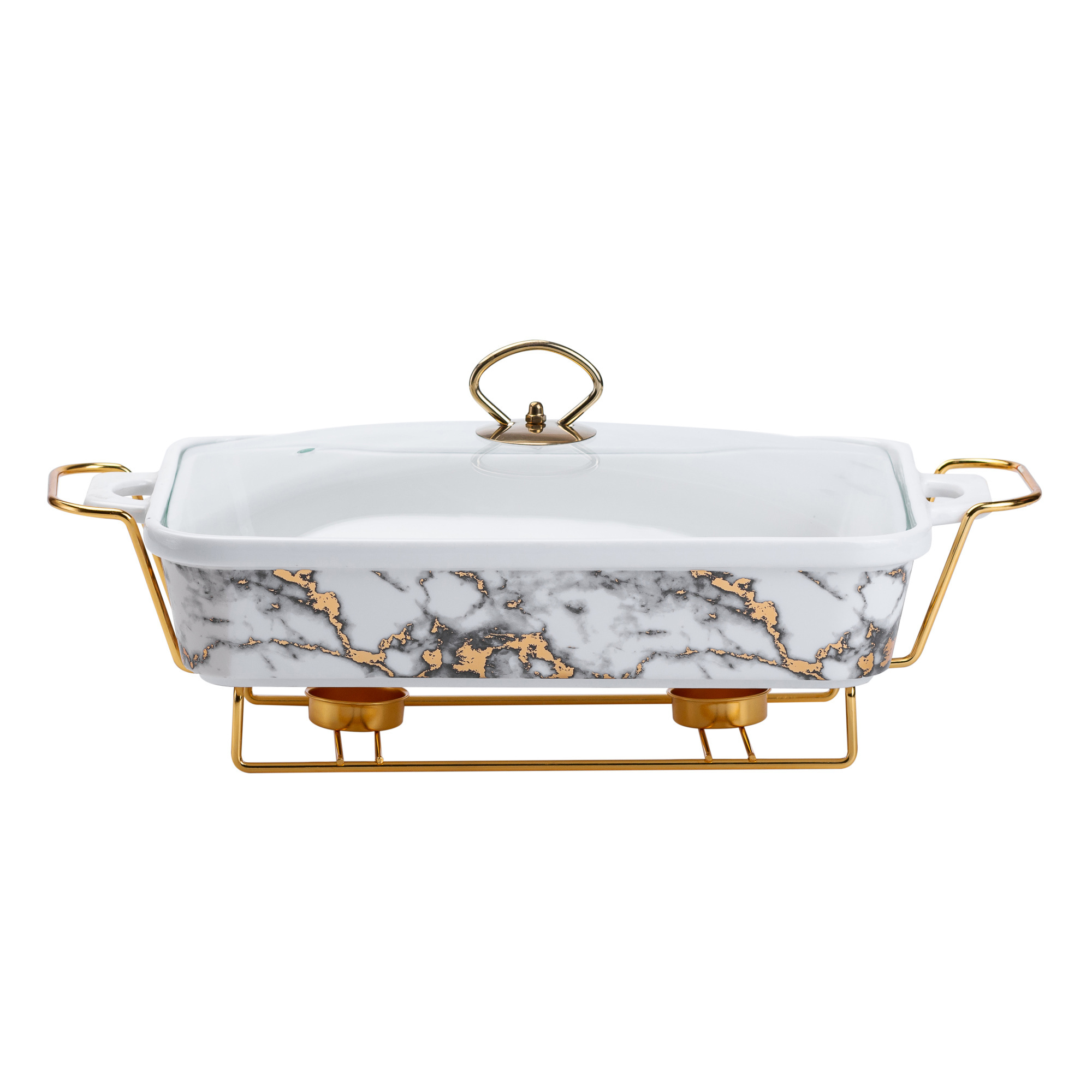 Обновите вашу сервировку роскошным и функциональным аксессуаром — прямоугольной керамической мармитницей объемом 2 л. Изготовленная из высококачественной керамики белого цвета с мраморным покрытием, эта мраморница отличается изящным и современным дизайном, который придаст элегантности любому столу. Стеклянная крышка позволяет легко контролировать процесс приготовления, не открывая мраморницу, а также обеспечивает надлежащую защиту пищи. Металлическая подставка золотистого цвета с подогревом не только подчеркивает стильный вид мармитницы, но и обеспечивает удобство, поддерживая горячими блюда в течение длительного времени. Это идеальное решение для праздничных обедов и продолжительных трапез. Дополнительно, мармитница оснащена удобными ручками с обеих сторон, что упрощает ее транспортировку и использование. Эта мраморница станет прекрасным дополнением к вашему кухонному арсеналу, сочетая эстетику и практичность в одном элегантном изделии. Характеристики: Размеры: 40*23*11 см Вес: 3.100 кг Объем: 2 литра Материал: керамика, стекло, нержавеющая сталь