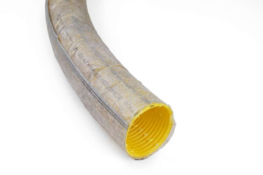Труба діаметром 100 мм, з шаром геотекстилю для захисту від замулення та забезпечення тривалого терміну експлуатації. Ідеально підходить для створення надійних дренажних систем.