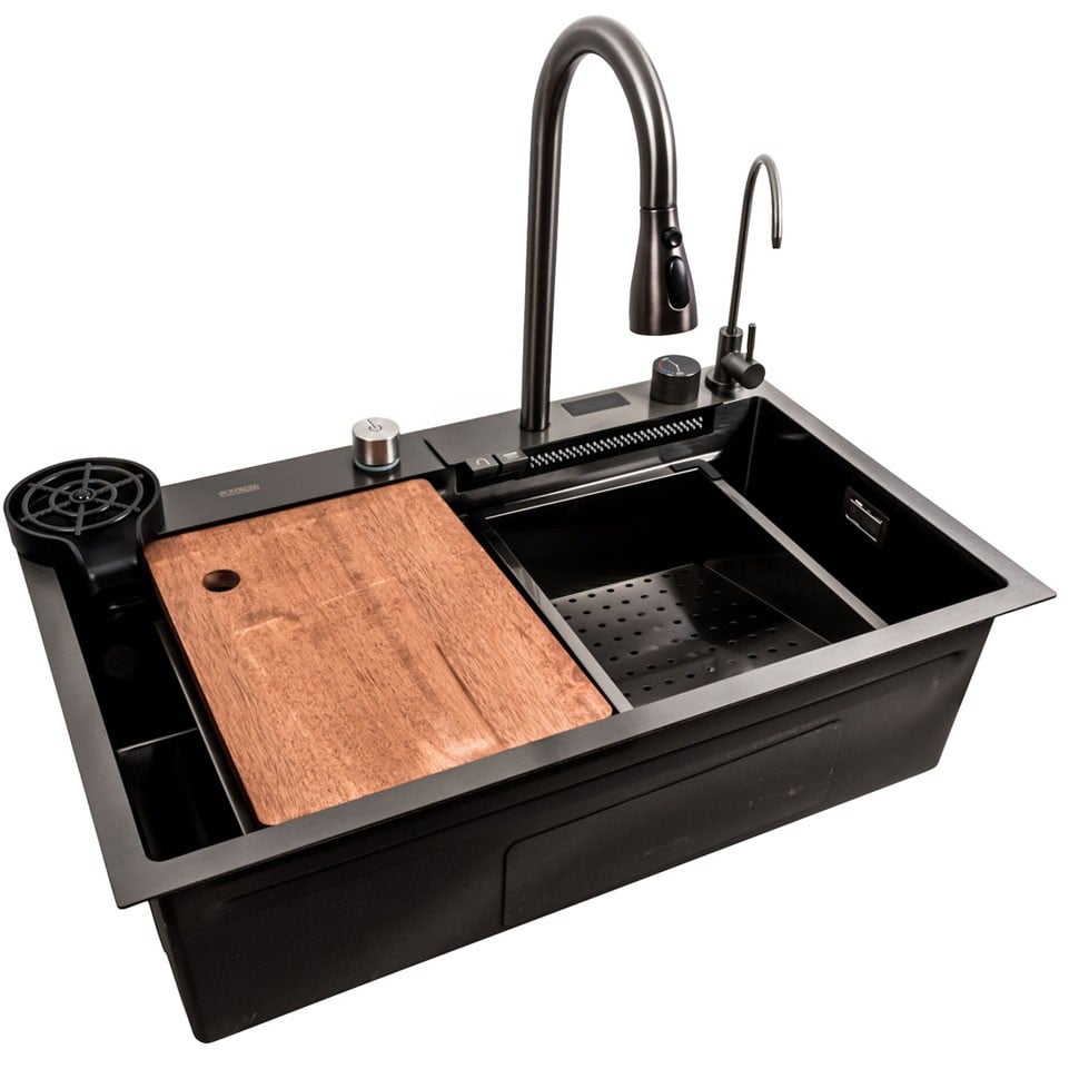 Габарити миття становлять 750×450 мм, глибина чаші близько 220 мм, що дозволяє комфортно мити навіть великий посуд. Модель оснащена вбудованою системою водоспадного типу, що забезпечує м'яку та спрямовану подачу води по задній стінці, що особливо зручно при ополіскуванні посуду або продуктів. В комплект входять змішувач, додатковий кран для питної води, вбудований ополіскувач для склянок, обробна дошка, металева сушка, підставка для овочів та фруктів, сифон із системою переливу, а також всі необхідні кріплення. Миття призначене для врізного монтажу, має продумане компонування та безліч вбудованих функцій, що робить її повноцінною робочою зоною на кухні. Platinex Handmade 75×45G Водоспад у сатиновому виконанні – це оптимальний вибір для тих, хто цінує комфорт, якість та сучасний дизайн.