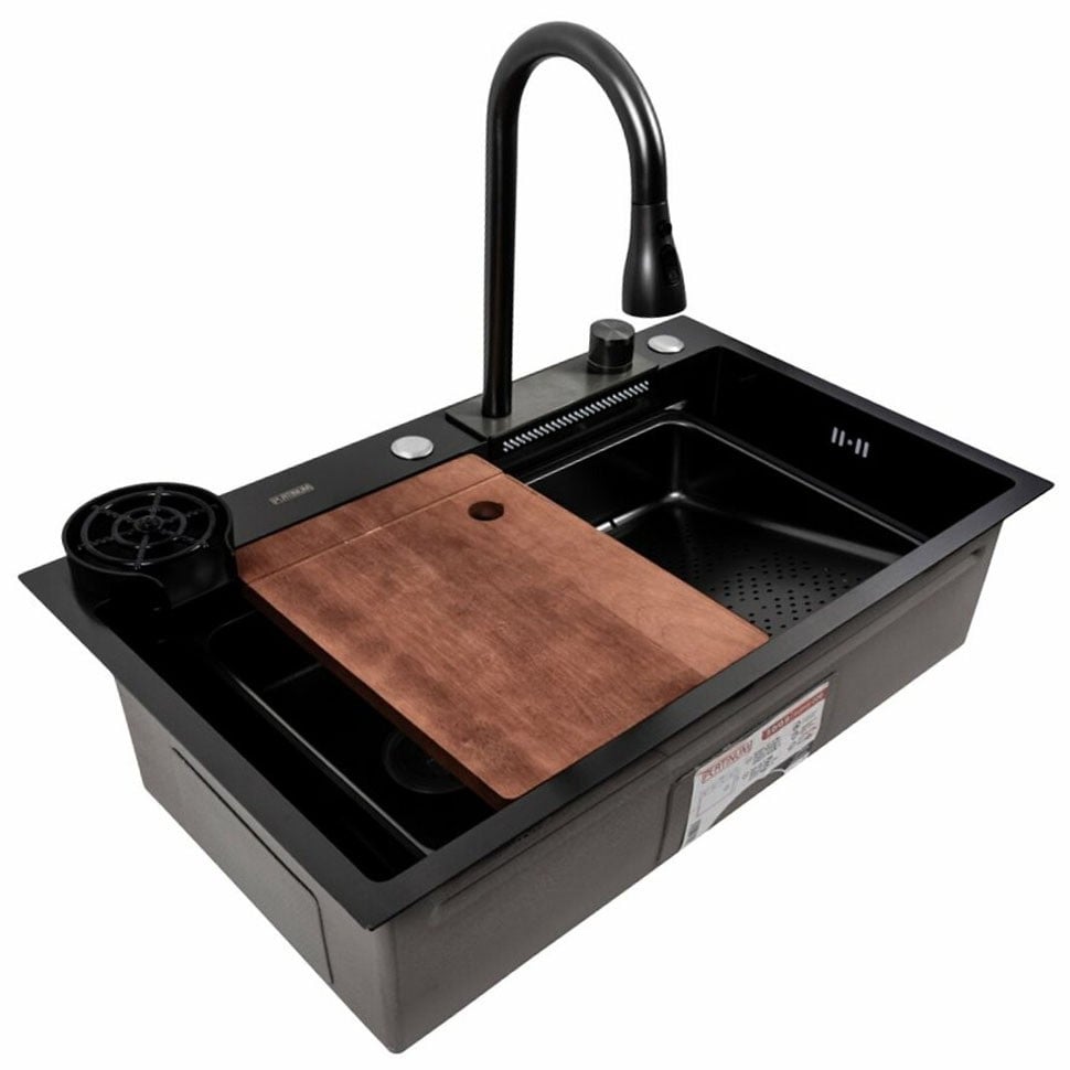 Кухонна мийка Platinex Handmade PVD «Водоспад» розміром 75×46×20 см – це стильне та функціональне рішення у чорному матовому виконанні. Виконана з нержавіючої сталі SUS 201 з PVD-покриттям, товщина стінок становить 0,8 мм, а посилене дно - 3,0 мм, що забезпечує довговічність та стійкість до пошкоджень та температурних перепадів.