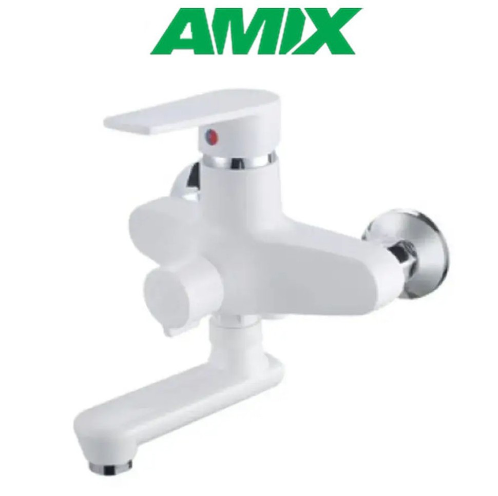 Змішувач для ванни AMIX Oscar-008 EURO SET White – це одноважільний настінний змішувач, виконаний у білому кольорі. Виготовлений з термопластику, що забезпечує стійкість до корозії та легкість очищення. Змішувач оснащений поворотним виливом довжиною 290 мм та керамічним картриджем діаметром 35 мм, що забезпечує плавне та точне регулювання температури та напору води. Перемикання між виливом і душем здійснюється за допомогою картриджного девіатора, який не залежить від тиску води. В комплект входять шланг, ручна лійка та кронштейн для лійки, що забезпечує зручність при використанні душу. Монтаж проводиться на стіну з використанням ексцентриків з міжосьовою відстанню 150 мм. Змішувач розрахований на робочий тиск від 1 до 5 бар та температуру води від 5°C до 90°C.