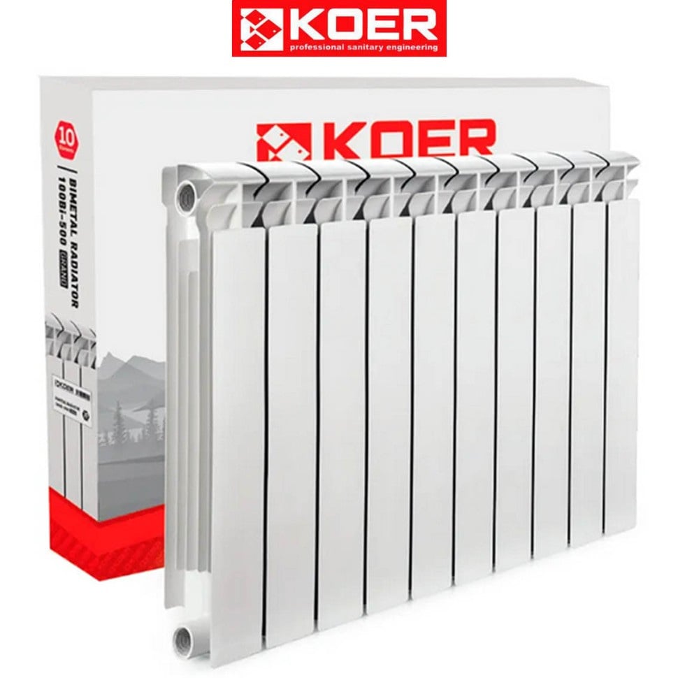 Біметалічний радіатор KOER– це повний біметал, тобто сталевий каркас горизонтальний та вертикальний. В результаті повністю виключається контакт теплоносія з алюмінієм (виключається корозія алюмінію), що значно продовжує термін служби радіатора. Ще перевагою повного біметалу є можливість роботи при високому тиску (робочий 20Атм, критичний 35Атм) та перепадах тиску.