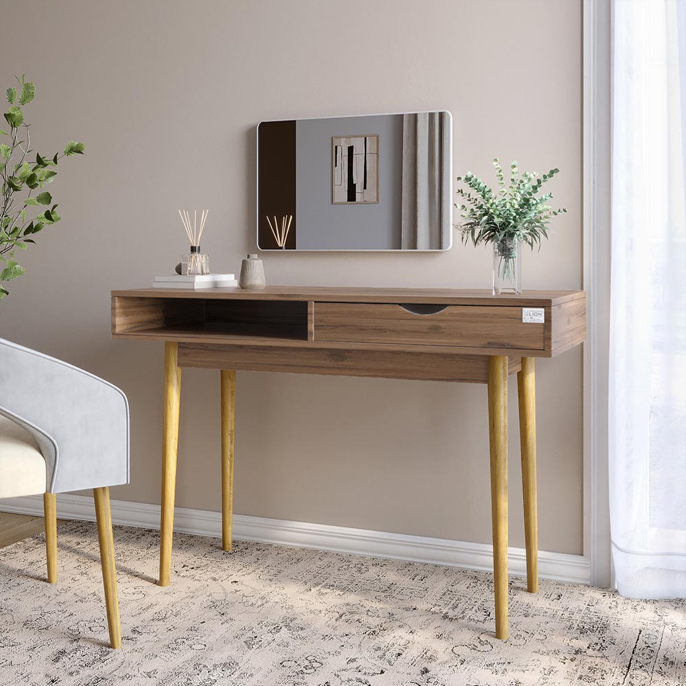 Письменный стол Lion Сканди-1 Столик Сканди-1 от Lion - это стильное решение в скандинавском стиле, которое сочетает в себе минимализм и функциональность. Компактный и элегантный, он идеально подходит для современных интерьеров. Благодаря продуманной конструкции и качественным материалам, столик обеспечивает комфортное место для хранения аксессуаров, ноутбука, добавляя вашей комнате уюта и организованности. Стол Lion Сканди-1 м Материал изготовления Столик изготовлен из ЛДСП SWISS KRONO – высококачественного материала, сочетающего эстетику с прочностью и надежностью. ЛДСП от SWISS KRONO известен своей стойкостью к механическим повреждениям, влаге и высоким температурам, что гарантирует долговечность мебели и сохраняет ее эстетичный вид на долгие годы. Деревянные ножки придают конструкции натуральной красоты и крепости, подчеркивая элегантность и современный стиль изделия. Особенности Компактные размеры. Идеально подходит для небольших помещений, не занимая много места, но обеспечивая достаточно пространства для хранения. Функциональные отделения. Продуманная конструкция с полочками или ящиками позволяет организовать хранение косметики и аксессуаров. Телескопические направляющие. Обеспечивает плавное и бесшумное открывание, позволяя удобно пользоваться пространством для хранения без усилий. Такая система повышает надежность и долговечность конструкции, а также обеспечивает полный доступ к содержимому ящика. Кромка 2 мм - защищает края изделий от повреждений, придает им эстетически завершенный вид и повышает долговечность мебели. Кромка изготавливается из прочных материалов, что позволяет ей выдерживать интенсивное использование и сохранять привлекательный внешний вид на протяжении многих лет. Стол Lion Сканди-1 Размеры: Ширина: 1204 мм Глубина: 484 мм Высота: 820 мм