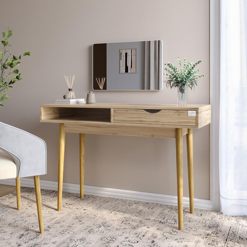 Письменный стол Lion Сканди-1 Столик Сканди-1 от Lion - это стильное решение в скандинавском стиле, которое сочетает в себе минимализм и функциональность. Компактный и элегантный, он идеально подходит для современных интерьеров. Благодаря продуманной конструкции и качественным материалам, столик обеспечивает комфортное место для хранения аксессуаров, ноутбука, добавляя вашей комнате уюта и организованности. Стол Lion Сканди-1 м Материал изготовления Столик изготовлен из ЛДСП SWISS KRONO – высококачественного материала, сочетающего эстетику с прочностью и надежностью. ЛДСП от SWISS KRONO известен своей стойкостью к механическим повреждениям, влаге и высоким температурам, что гарантирует долговечность мебели и сохраняет ее эстетичный вид на долгие годы. Деревянные ножки придают конструкции натуральной красоты и крепости, подчеркивая элегантность и современный стиль изделия. Особенности Компактные размеры. Идеально подходит для небольших помещений, не занимая много места, но обеспечивая достаточно пространства для хранения. Функциональные отделения. Продуманная конструкция с полочками или ящиками позволяет организовать хранение косметики и аксессуаров. Телескопические направляющие. Обеспечивает плавное и бесшумное открывание, позволяя удобно пользоваться пространством для хранения без усилий. Такая система повышает надежность и долговечность конструкции, а также обеспечивает полный доступ к содержимому ящика. Кромка 2 мм - защищает края изделий от повреждений, придает им эстетически завершенный вид и повышает долговечность мебели. Кромка изготавливается из прочных материалов, что позволяет ей выдерживать интенсивное использование и сохранять привлекательный внешний вид на протяжении многих лет. Стол Lion Сканди-1 Размеры: Ширина: 1204 мм Глубина: 484 мм Высота: 820 мм