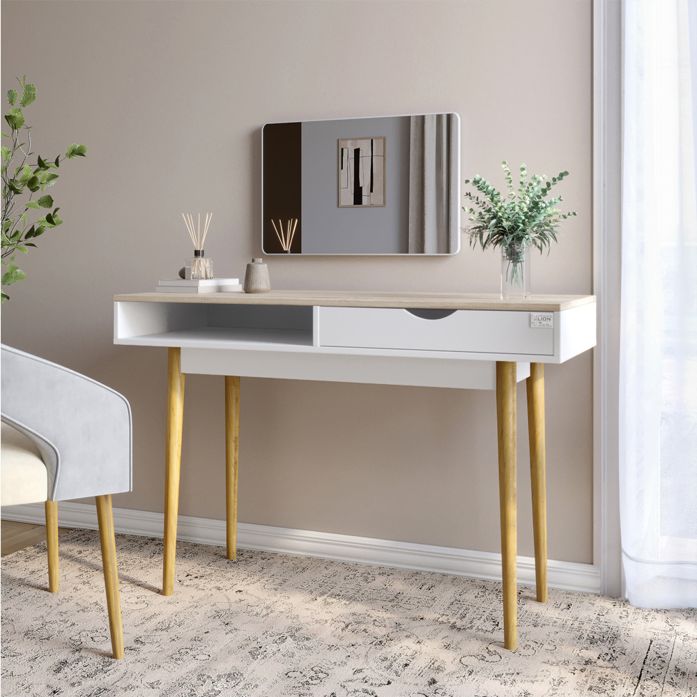 Письменный стол Lion Сканди-1 Столик Сканди-1 от Lion - это стильное решение в скандинавском стиле, которое сочетает в себе минимализм и функциональность. Компактный и элегантный, он идеально подходит для современных интерьеров. Благодаря продуманной конструкции и качественным материалам, столик обеспечивает комфортное место для хранения аксессуаров, ноутбука, добавляя вашей комнате уюта и организованности. Стол Lion Сканди-1 м Материал изготовления Столик изготовлен из ЛДСП SWISS KRONO – высококачественного материала, сочетающего эстетику с прочностью и надежностью. ЛДСП от SWISS KRONO известен своей стойкостью к механическим повреждениям, влаге и высоким температурам, что гарантирует долговечность мебели и сохраняет ее эстетичный вид на долгие годы. Деревянные ножки придают конструкции натуральной красоты и крепости, подчеркивая элегантность и современный стиль изделия. Особенности Компактные размеры. Идеально подходит для небольших помещений, не занимая много места, но обеспечивая достаточно пространства для хранения. Функциональные отделения. Продуманная конструкция с полочками или ящиками позволяет организовать хранение косметики и аксессуаров. Телескопические направляющие. Обеспечивает плавное и бесшумное открывание, позволяя удобно пользоваться пространством для хранения без усилий. Такая система повышает надежность и долговечность конструкции, а также обеспечивает полный доступ к содержимому ящика. Кромка 2 мм - защищает края изделий от повреждений, придает им эстетически завершенный вид и повышает долговечность мебели. Кромка изготавливается из прочных материалов, что позволяет ей выдерживать интенсивное использование и сохранять привлекательный внешний вид на протяжении многих лет. Стол Lion Сканди-1 Размеры: Ширина: 1204 мм Глубина: 484 мм Высота: 820 мм