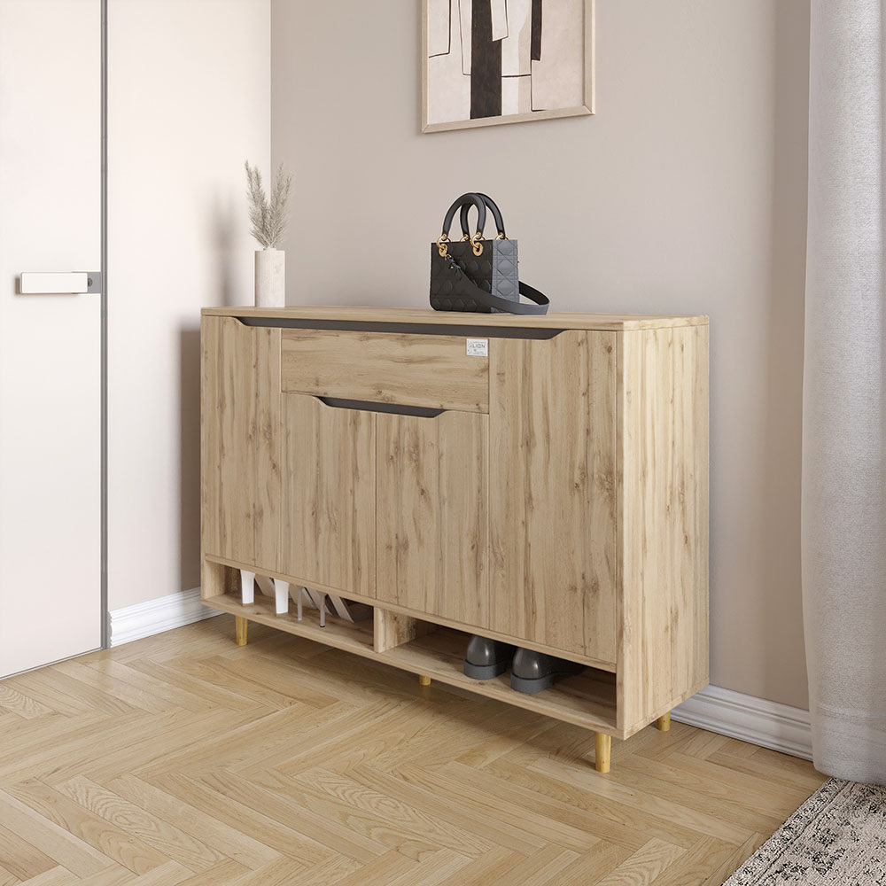Тумба для обуви в прихожую Lion Салливан Тумба-2 Тумба-2 из коллекции Салливан – это стильная и функциональная тумба для обуви в прихожую, разработанный с учетом всех требований современных интерьеров. Салливан Тумба-2 – это сочетание стиля, практичности и качества, которое подчеркнет ваш вкус и добавит уют в ваш дом. Тумба для обуви в прихожую Lion Салливан Тумба-2 Материал изготовления Тумба для обуви в прихожую изготовлена из высококачественной ЛДСП SWISS KRONO, эта тумба отличается прочностью, долговечностью и высокой устойчивостью к внешним воздействиям. ЛДСП SWISS KRONO – это материал премиум-класса, который известен своей экологичностью и безопасностью для здоровья. Он обладает отличными характеристиками влагостойкости, устойчивости к механическим повреждениям и сохранению цвета даже при длительном использовании. Деревянные ножки придают конструкции натуральной красоты и крепости, подчеркивая элегантность и современный стиль изделия. Особенности Тумба оснащена вместительной полкой для обуви, что позволяет удобно организовать пространство в прихожей и поддерживать порядок. Ящик оснащен телескопическими направляющими, что позволяет плавно открывать их даже при значительной нагрузке. Тумба для обуви предлагает достаточно места для хранения белья, аксессуаров и других предметов. Кромка 2 мм - защищает края изделий от повреждений, придает им эстетически завершенный вид и повышает долговечность мебели. Кромка изготавливается из прочных материалов, что позволяет ей выдерживать интенсивное использование и сохранять привлекательный внешний вид на протяжении многих лет. Тумба для обуви Lion Ларри-1 Размеры: Ширина: 1200 мм Глубина: 330 мм Высота: 830 мм