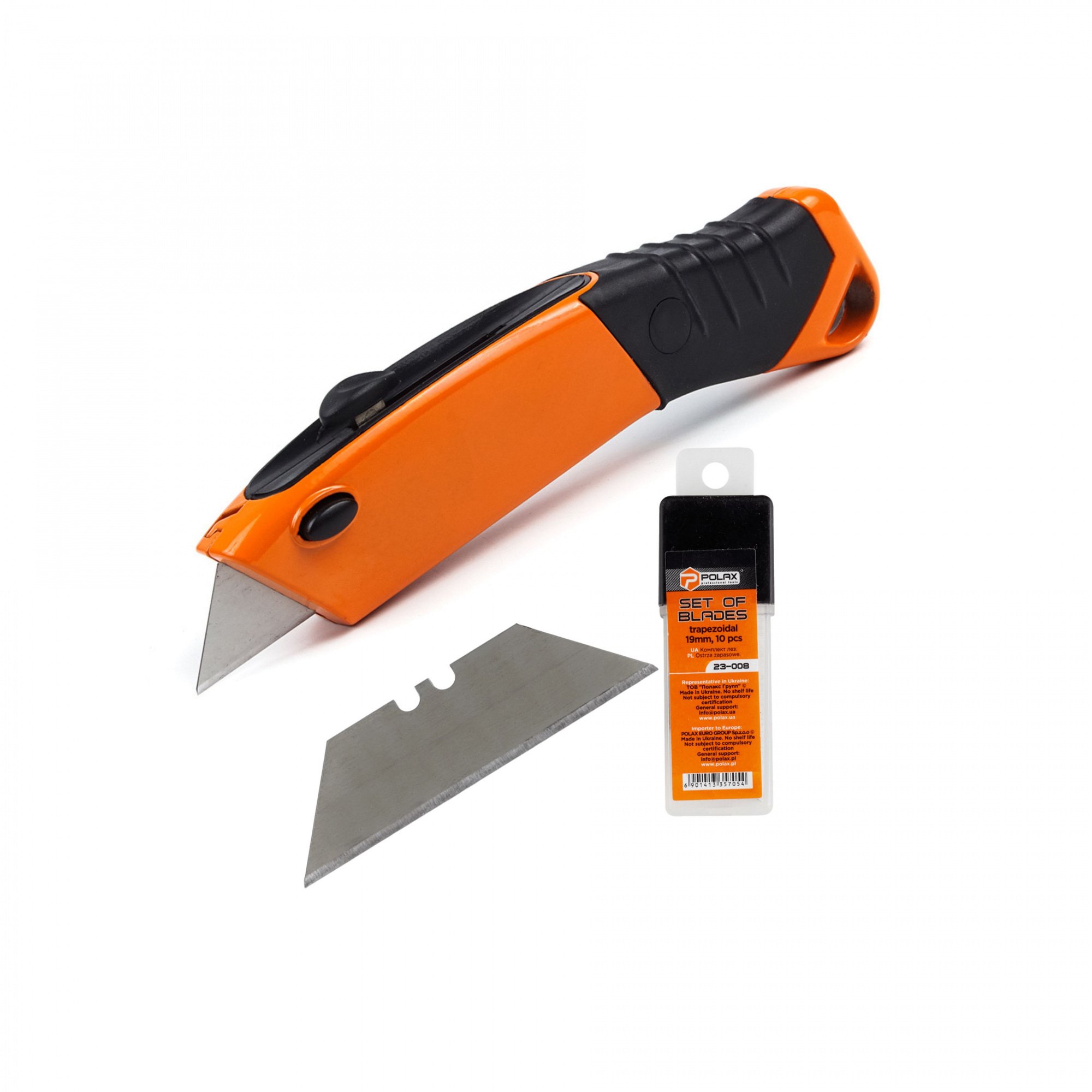 Нож трапециевидный и комплект лезвий трапециевидных 19 мм, 10 шт. Polax (335-72) Набор Polax (335-72) – это надежный инструмент для точной и безопасной резки различных материалов. Идеально подходит для строительных, ремонтных, упаковочных работ и бытового использования. В комплект входят: Нож строительный Polax трапециевидный, 19 мм (23-007) – эргономичный корпус с нескользкими вставками обеспечивает удобство в работе. Выдвижное лезвие с фиксатором гарантирует точность и безопасность при использовании. Быстрая замена лезвия без дополнительных инструментов. Комплект трапециевидных лезвий Polax, 19 мм – 10 шт. (23-008) - изготовлены из качественной стали, имеют повышенную износостойкость и длительный срок службы. Подходят для работы с картоном, кожей, линолеумом, пластиком и т.д. Преимущества набора: Надежный нож с крепкой конструкцией Трапецообразное лезвие для большей точности и контроля Прорезиненные вставки для безопасного хвата 10 сменных лезвий в комплекте Подходит для бытовых и профессиональных задач Практичный и удобный комплект для тех, кто ценит качество, безопасность и эффективность.