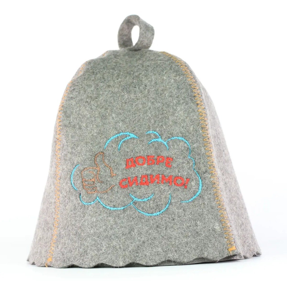 Банная шапка с вышивкой "Добре сидимо" изготовлена из натурального войлока. Цвет войлока серый.