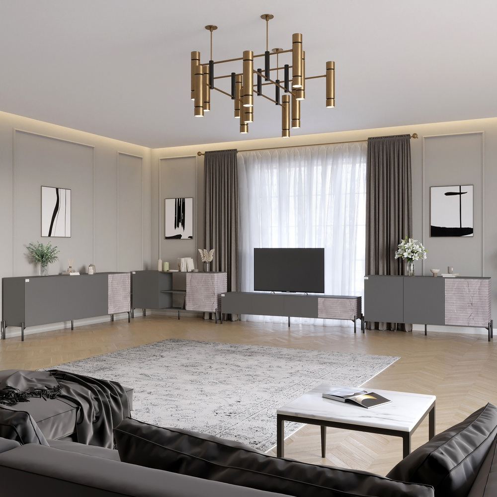 Комплект модульный 4 элемента LION Грей Комплект мебели для гостиной LION Грей - станет гармоничным дополнением вашего дома, сочетая стильный внешний вид с удобством и долговечностью. Металлические ножки обеспечивают устойчивость и легкость конструкции, а рельефные детали на фасаде добавляют оригинальности и динамичности в интерьер. В состав комплекта входят комод, комод открытый, комод закрытый, а также тумба ТВ. Комплект идеально подходит для интерьеров в стиле минимализм, лофт или модерн. Материал изготовления Комод изготовлен из ЛДСП SWISS KRONO - высококачественного материала, сочетающего эстетику с прочностью и надежностью. ЛДСП от SWISS KRONO известен своей стойкостью к механическим повреждениям, влаге и высоким температурам, что гарантирует долговечность мебели и сохраняет ее эстетичный вид на долгие годы. Металлические черные ножки обеспечивают устойчивость и придают изделию современного стиля, дополняя общий образ тумбы. Особенности Модульная структура. Комплект состоит из нескольких независимых элементов, которые можно комбинировать по вашему желанию. Это позволяет адаптировать мебель к различным пространствам. Минималистичная фурнитура. Отсутствие внешних ручек делает конструкцию более лаконичной. Прочные металлические ножки. Ножки из черного металла обеспечивают устойчивость мебели и добавляют легкости в общем виде. Высота ножек упрощает уборку под мебелью. Кромка 2 мм - защищает края изделий от повреждений, придает им эстетически завершенный вид и повышает долговечность мебели. Кромку изготавливают из прочных материалов, что позволяет ей выдерживать интенсивное использование и сохранять привлекательный внешний вид в течение многих лет. Размеры: Комод: Ширина: 2040 мм Глубина: 380 мм Высота: 765 мм Тумба для ТВ: Ширина: 2040 мм Глубина: 380 мм Высота: 465 мм Комод открытый: Ширина: 1540 мм Глубина: 380 мм Высота: 765 мм Комод закрытый: Ширина: 1540 мм Глубина: 380 мм Высота: 765 мм