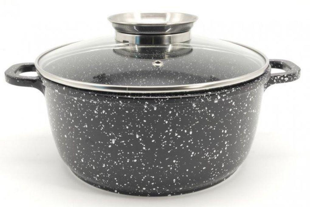 Кастрюля изготовлена из высококачественного литого алюминия, покрытого специальным антипригарным мраморным покрытием. Благодаря покрытию, посуда имеет высокую износостойкость и имеет высокую теплопроводность. Уникальная конструкция дна обеспечивает равномерный нагрев по всей поверхности, соответственно пища в ней готовится быстрее. Главная особенность такой посуды - возможность приготовления вкусной и полезной пищи  без добавления масла. Мраморное покрытие безопасно для здоровья человека и позволит сохранить в продуктах максимум витаминов. Кастрюля жаропрочная и может использоваться также для духовок. К кастрюле идет крышка из термостойкого стекла . Кастрюлю можно использовать на плитах любого типа, в том числе и индукционных.