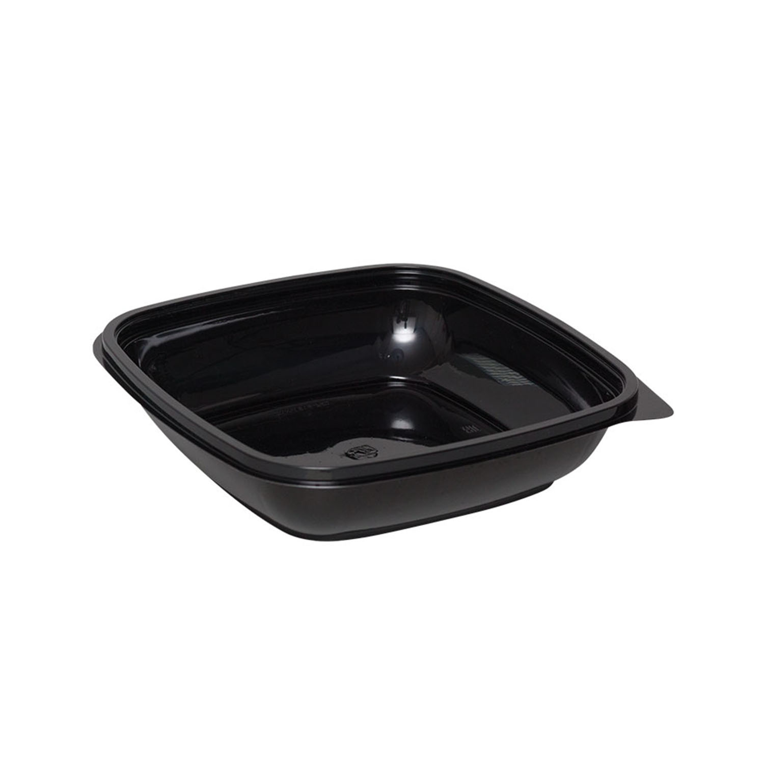 Салатники подходят для хранения, доставки салатов и холодных закусок. Контейнеры плотно закрываться крышки. Изготовлены из пластика PET, черного цвета. Одноразовые емкости для салатов продаются в упаковках по 70 штук. На поверхности можно размещать этикетки. Объём: 750 мл. Размер: 190х190х42 мм.