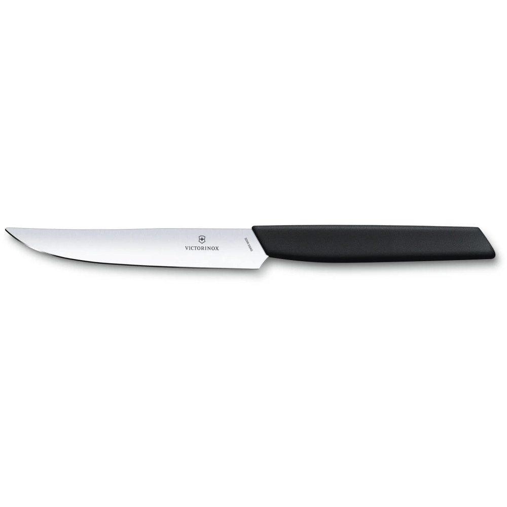 Швейцарский нож для стейка Swiss Modern Steak с очень острым гладким лезвием и современной рукоятью черного цвета. Насладитесь легким отрезанием кусочка сочного мяса на вашей тарелке.