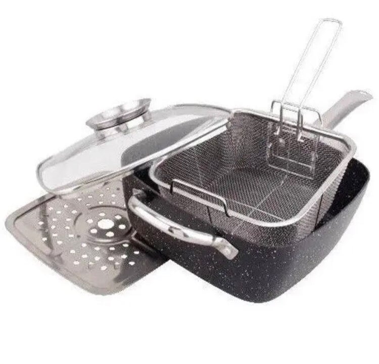 Высококачественная квадратная глубокая сковорода предназначена как сковорода, фритюрница, противень для выпечки, макароноварка и пароварка.