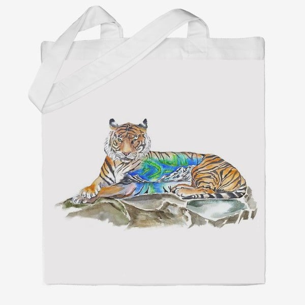 Эко-сумка шоппер с принтом Тигр с пейзажем Кавун Бежевый