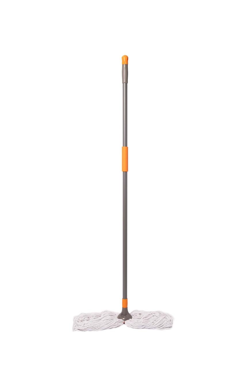 Швабра для пола "KORNEL" - предназначена для мытья кафеля, линолеума, ламината, паркета от разного рода загрязнений. Благодаря хлопковой пряже хорошо собирает и удерживает значительное количество воды с поверхности пола и хорошо собирает грязь. Швабра изготовлена из достаточно прочного металла и пластика, что обеспечивает простоту и надежность в эксплуатации. Длина ручки 140 см. Хлопковая насадка имеет длину 25 см., диаметр 15 см. Очень удобна и надежна в использовании.