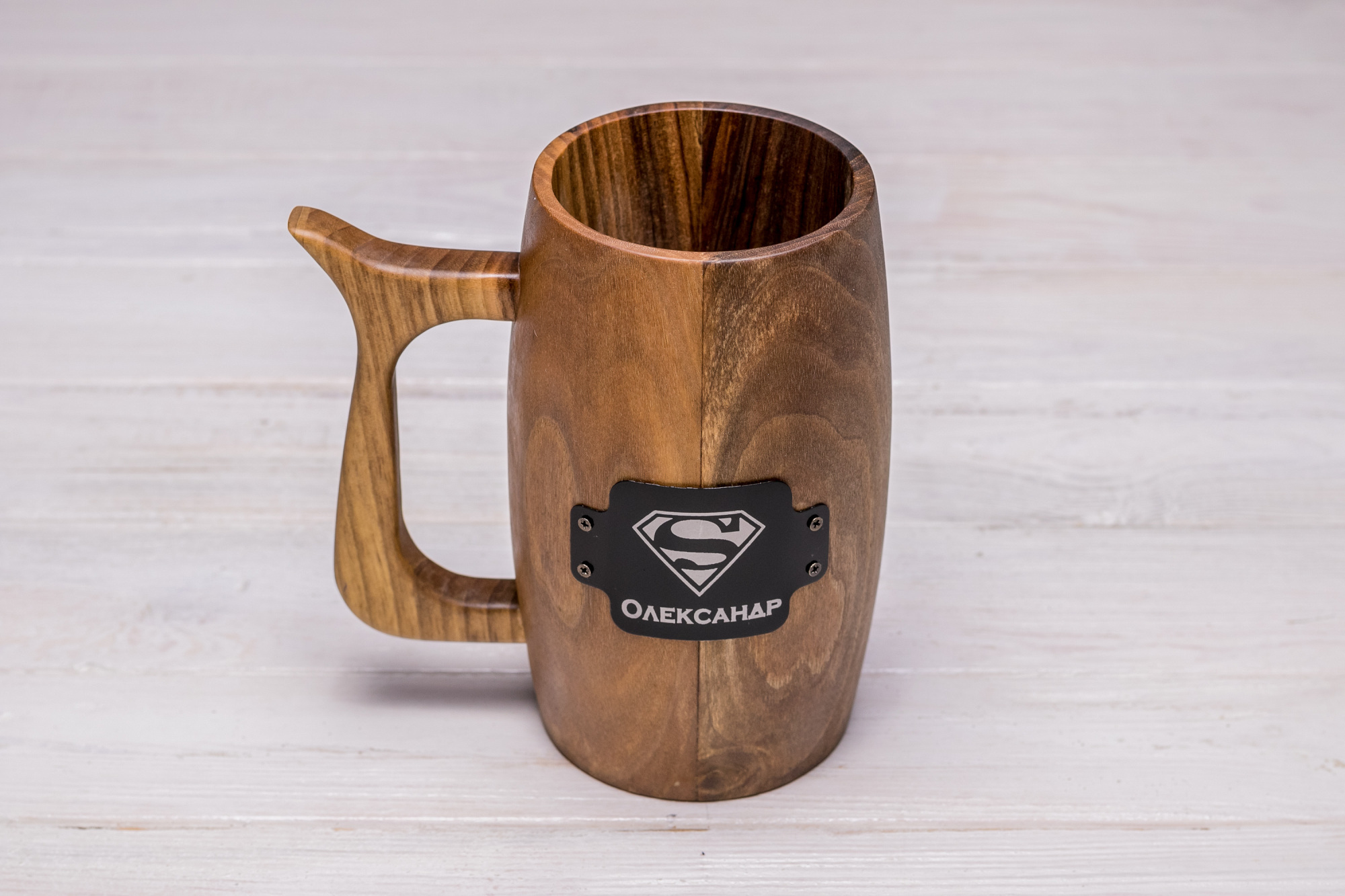 Деревянный цельный (состоит из двух половинок, ручки и дна) бокал EcoWalnut для холодных напитков с металлической бляхой. При употреблении хмельных напитков из деревянного бокала (в отличии от стеклянного) пенка не падает очень длительный период времени. Стук деревянного бокала несомненно куда более приятен и процесс распития пива превращается в веселую и легендарную затею. Кроме этого - бокал невозможно разбить.
