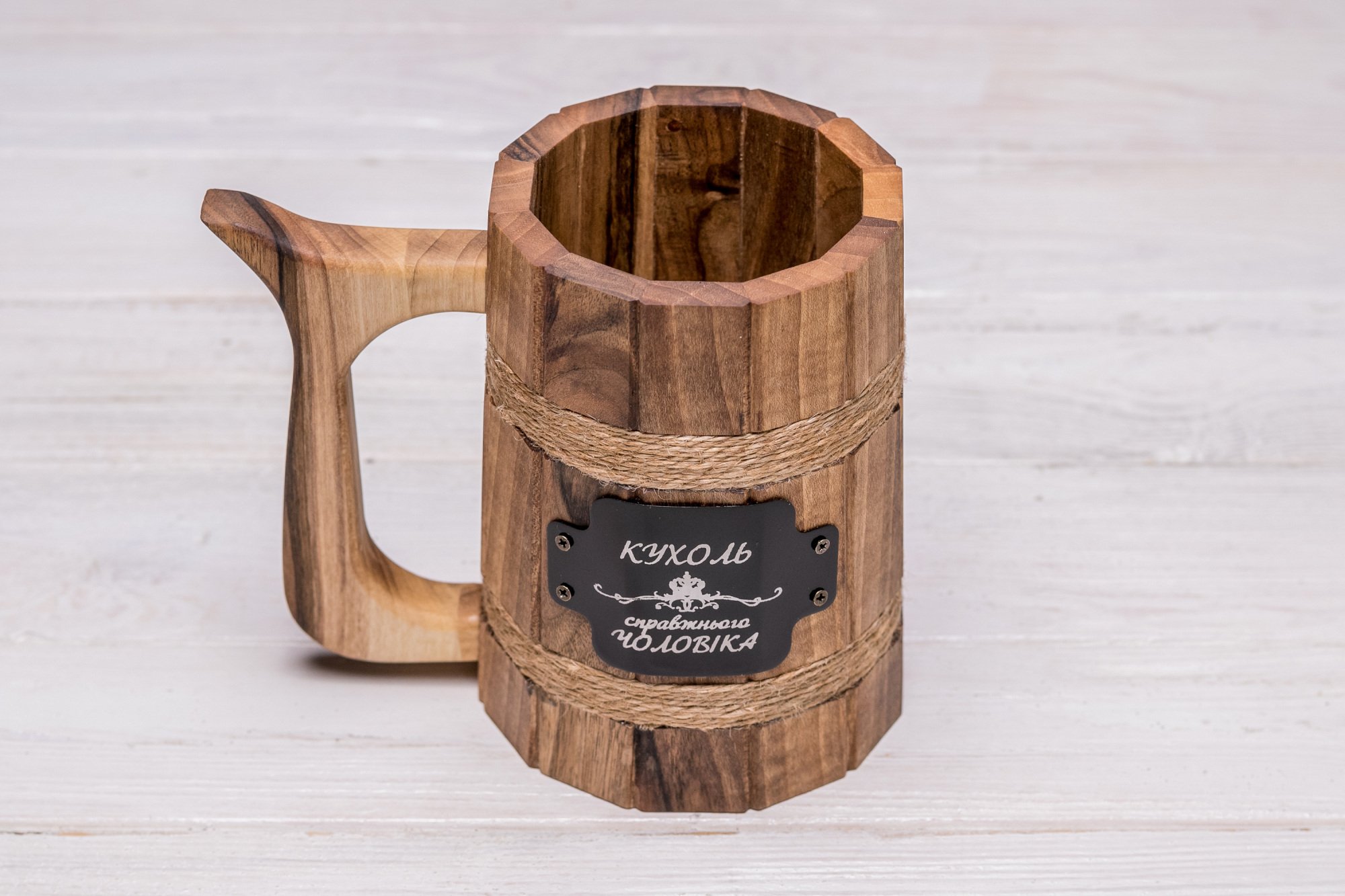 Деревянный сегментный (состоит из сегментов, ручки и дна) бокал EcoWalnut конусной формы для холодных напитков с металлической бляхой. При употреблении хмельных напитков из деревянного бокала (в отличии от стеклянного) пенка не падает очень длительный период времени. Стук деревянного бокала несомненно куда более приятен и процесс распития пива превращается в веселую и легендарную затею. Кроме этого - бокал невозможно разбить.
